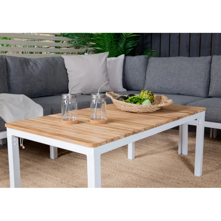 En sofagruppe der imponerer med sit moderne design og lige nordiske former! I sofagruppen finder du hjørnesofaen fra Copacabana med hvid pulverlakeret metalramme og bløde grå puder samt et lavt sofabord fra Brazil-serien – en flot matchende kombination, der er perfekt til både udendørsarealer og balkoner. Skab et hyggeligt område med masser af plads til socialt samvær denne sommer! Plejeråd: Alle puder til udendørsmøblerne skal tages ind og bør ikke være ude, når de ikke er i brug. Ved snavs og pletter anbefaler vi, at du kun vasker med vand og sæbe, ikke højtryksvask eller andet. Opbevar altid puderne i en dunboks eller i et andet tørt miljø for at undgå misfarvning og forlænge levetiden.
