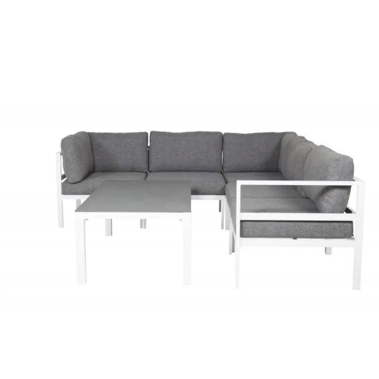 Med bærbare moduler kan du tilpasse og bygge den lounggruppe, du altid har drømt om! Denne hjørnedel tilhører Copacabana-serien og er i hvid aluminium med bløde grå puder for ekstra komfort. Med hjælp fra dette modul kan du skræddersy din sofagruppe efter smag og plads. Her sammen med et sofabord fra samme serie. Bordpladen er i gråt sprayglas og basen i hvid aluminium for at matche sofaen. Tilpas til din særlige terrasse!