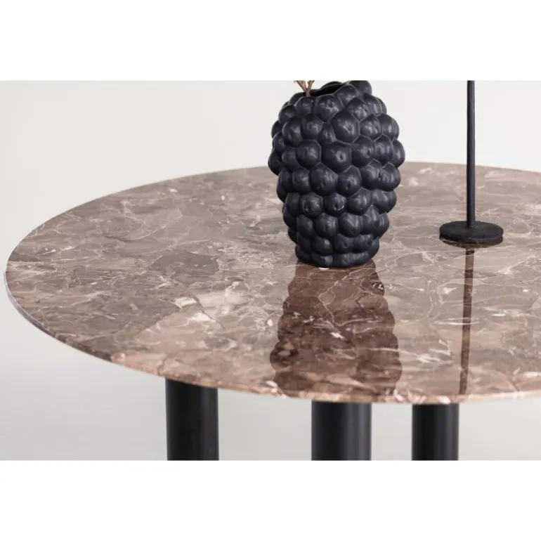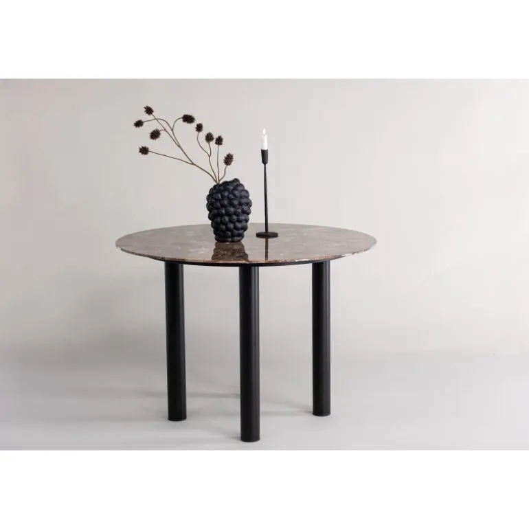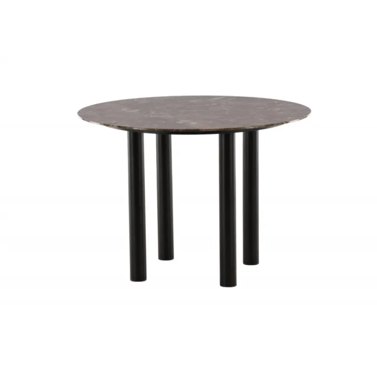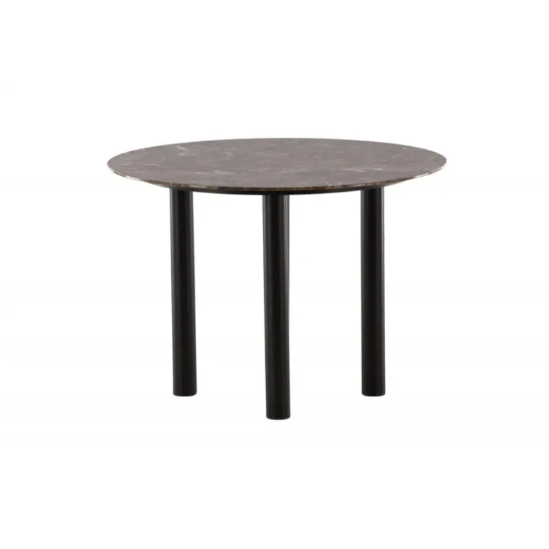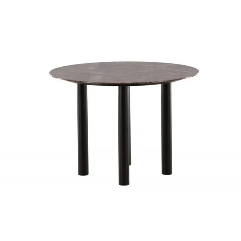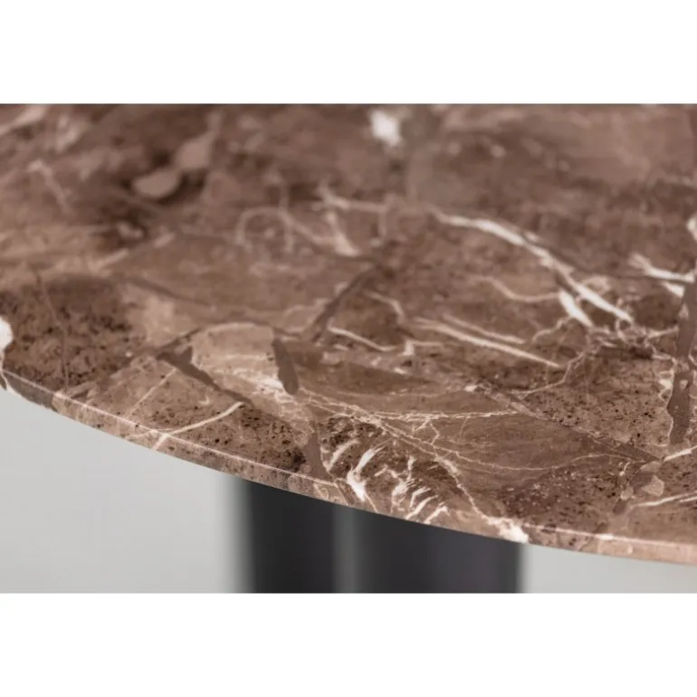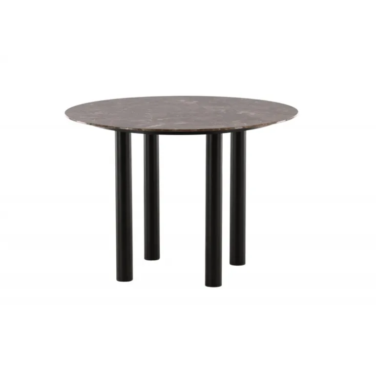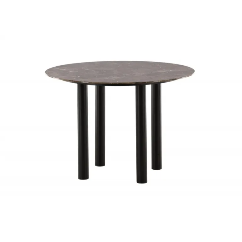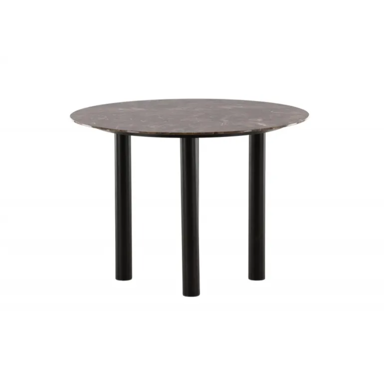 Et spisebord, der fanger øjet og imponerer med sit smagfulde design! Spisebordet fra Havsten serien har en rund bordplade i brun imiteret marmor, der giver møblet et spejlet liv. Rundt spisebordbenene er cylindriske i sort metal. Et rundt spisebord er perfekt til at skabe fællesskab ved måltiderne, her ender ingen på kanten! Dekorér dit hjem med en flot marmordetalje og bemærk, hvordan stilniveauet øges! Mål: Ø106 H75.