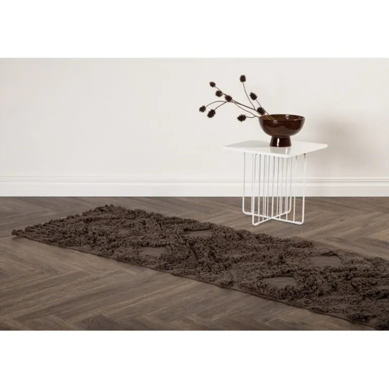 Skab en hyggelig atmosfære i dit hjem med et tæppe, der giver et moderne udseende til interiøret og en varm følelse. Uldtæppet fra Hilma-serien er en lang, smal, rektangulær drøm i moderne vintage, her i en slank brun farve. Tæppet har et tuftet mønster i højere luv og en flettet frynsekant langs de korte sider, der bidrager til et klassisk design kombineret med det trendy. Materialets holdbare egenskaber gør tæppet velegnet til de fleste rum. Placer det alene i gangen eller i stuen for at løfte stilniveauet et par trin! Mål: 200×70 cm.