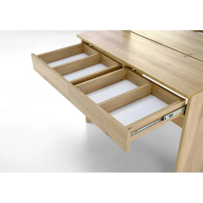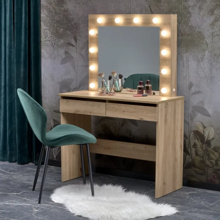 Oplev den perfekte blanding af stil og funktionalitet med vores HOLLYWOOD Sminkebord i eg. Dette elegante Sminkebord er fremstillet af lamineret spånplade, hvilket sikrer holdbarhed og en moderne finish. Med integrerede LED-lys skaber det en behagelig arbejdsmiljø. Dets kompakte dimensioner på 94/43/140 cm gør det ideelt til både små og store soveværelser . Sminkebord leveres i to kasser og har en nettovægt på 31.000 kg.