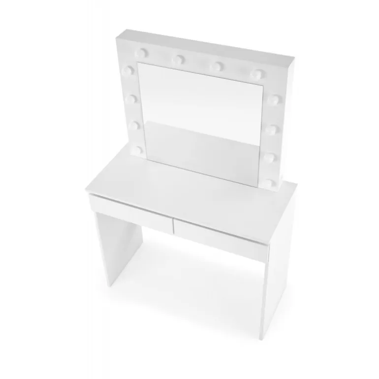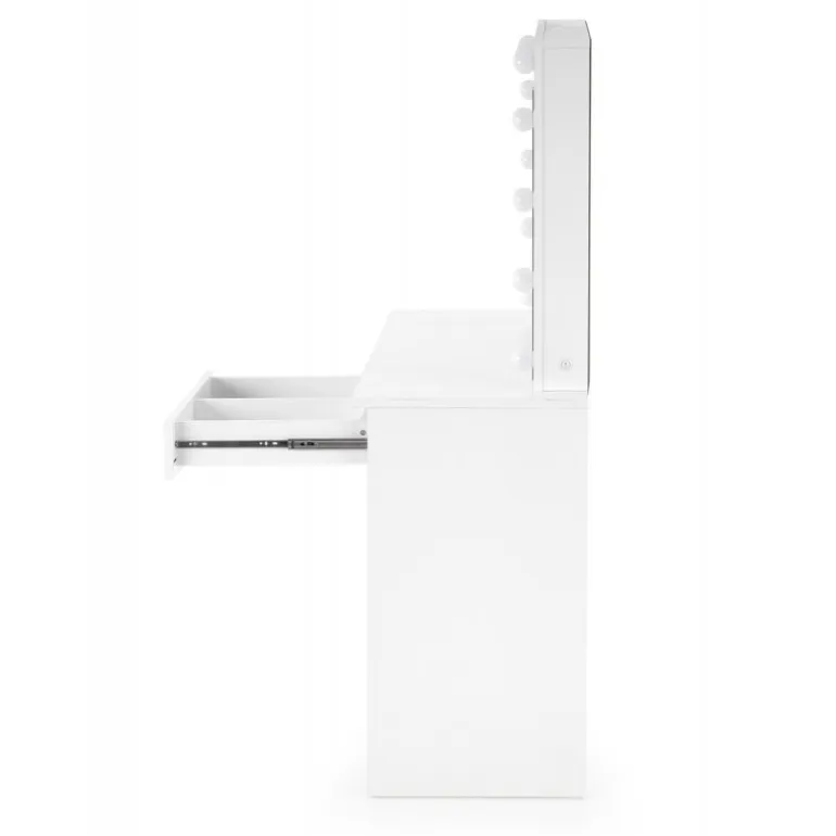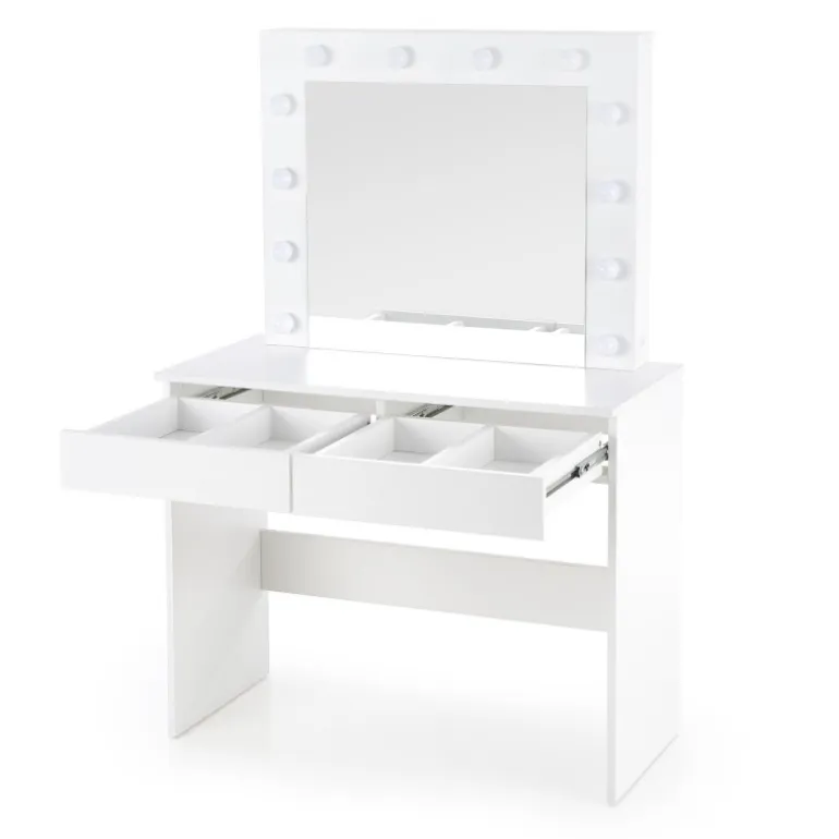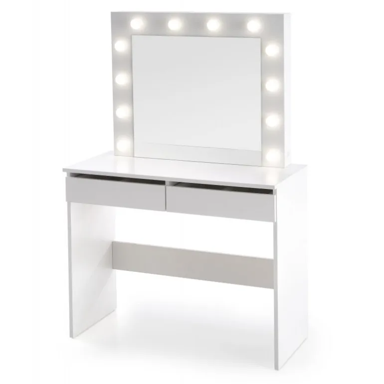 HOLLYWOOD Sminkebord med spejl i hvid farve er det perfekte valg til dit soveværelset. Moderne design kombineret med funktionalitet gør dette bord ideelt til både at smikne sig og studier. Bordpladen er lavet af lamineret spånplade, der sikrer holdbarhed og let vedligeholdelse. Med LED-lys integreret i designet får du en stilfuld og praktisk løsning, der lyser dit arbejdsområde op. Med dimensionerne 94/43/140 cm passer dette Sminkebord perfekt ind i de fleste rum, og dets hvide finish tilføjer et elegant touch til enhver indretning.