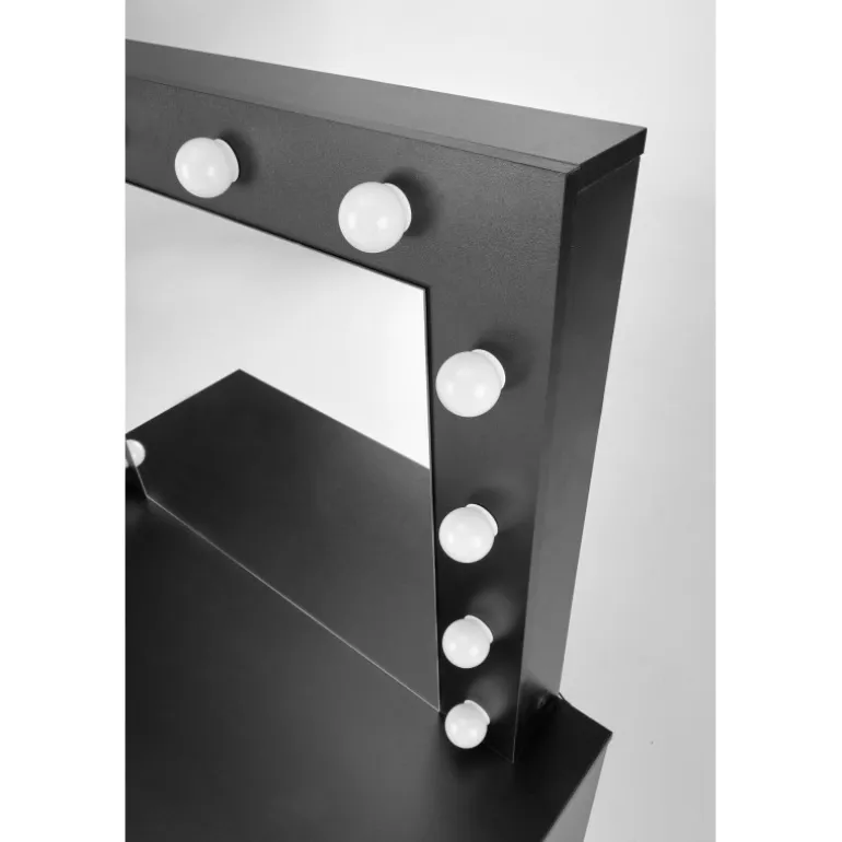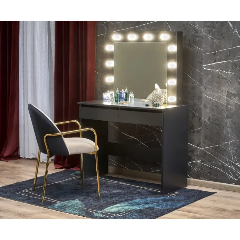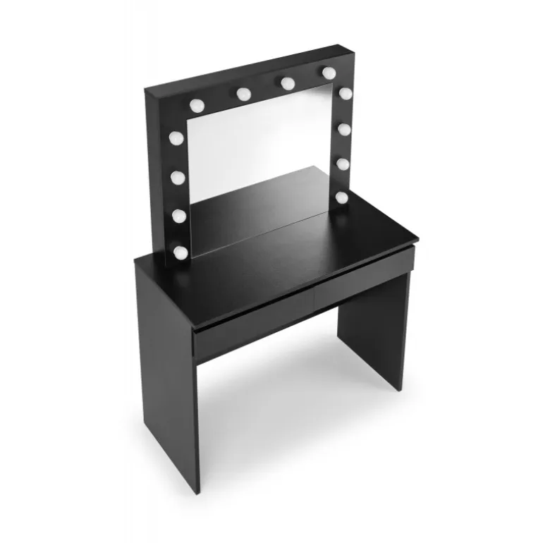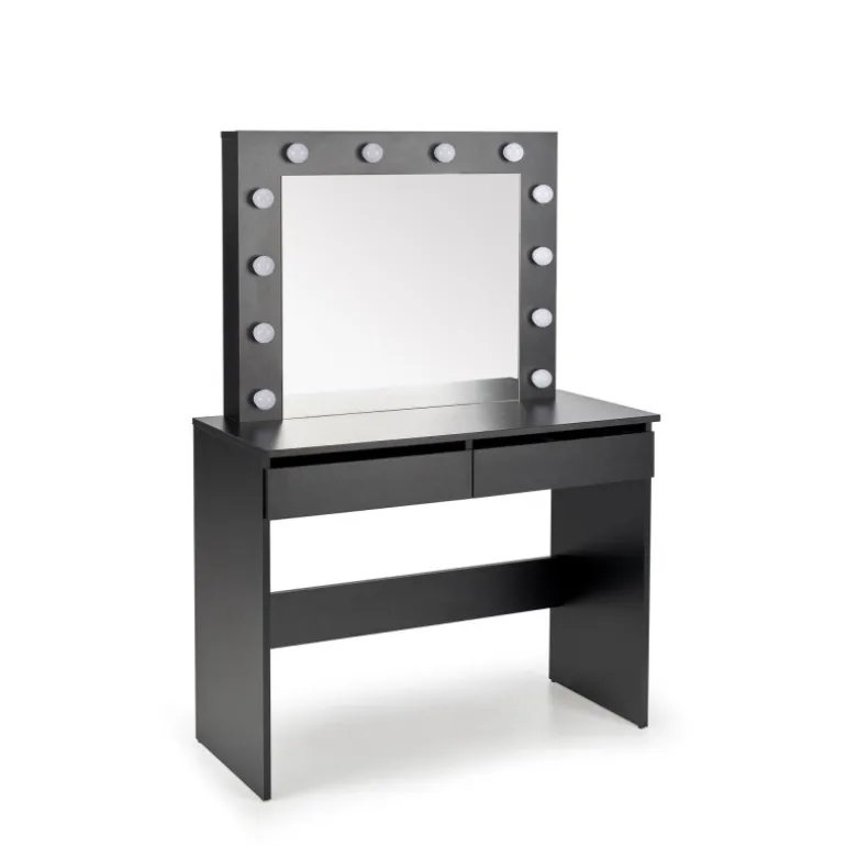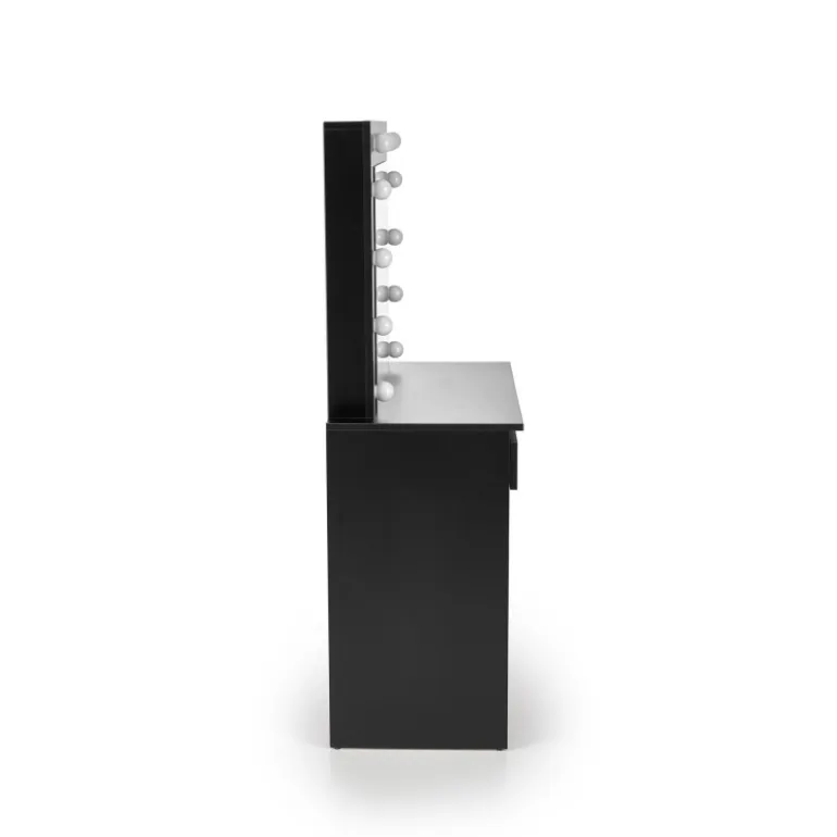 Oplev en moderne og elegant Sminkebord i Sort. Dette skrivebord er designet til at forbedre dit soveværelse eller arbejdsplads med et stilfuldt og funktionelt møbel. Lavet af holdbare laminerede spånplader og udstyret med indbyggede LED-lys, tilbyder dette Sminkebord både holdbarhed og æstetisk appel. Med dimensionerne 94/43/140 cm passer det nemt ind i de fleste værelser mens den Sorte farve tilføjer et strejf af sofistikation.