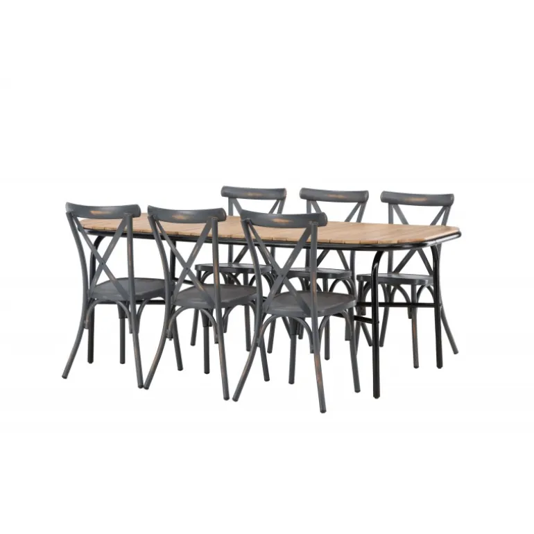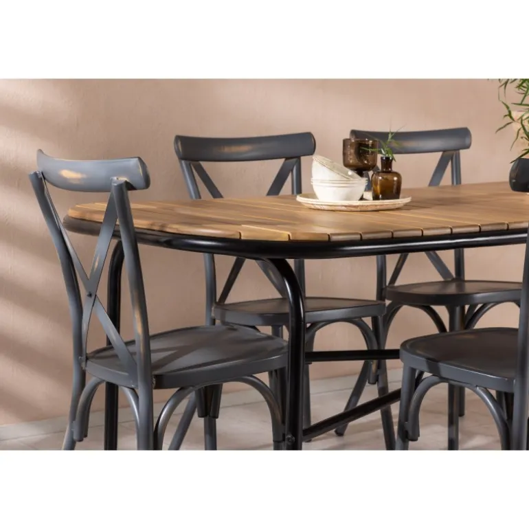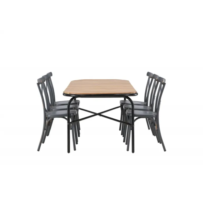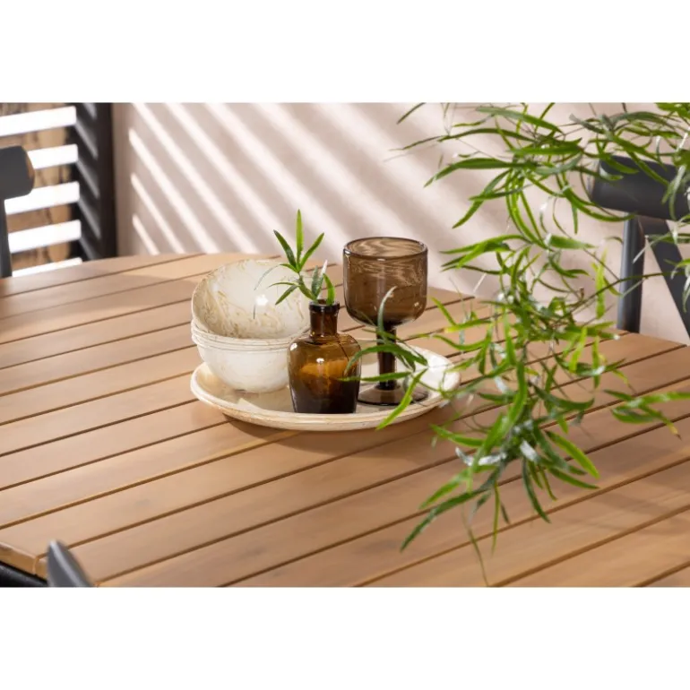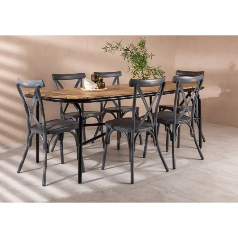 Kombinationen af Holmbeck bordet og Tablas stolene er perfekt til terrassen denne sommer! Bordet har en rektangulær bordplade i elegant akacietræ med afrundede kanter og en minimalistisk base i sort stål. Stolene har en industriel stil og er lavet af holdbart aluminium i en sodet sort farve. Loungesæt – Havemøbelsættet er velegnet til udendørs brug, men passer selvfølgelig også perfekt i udestuen! Bordets mål: 200x90x75cm.
