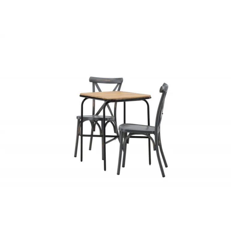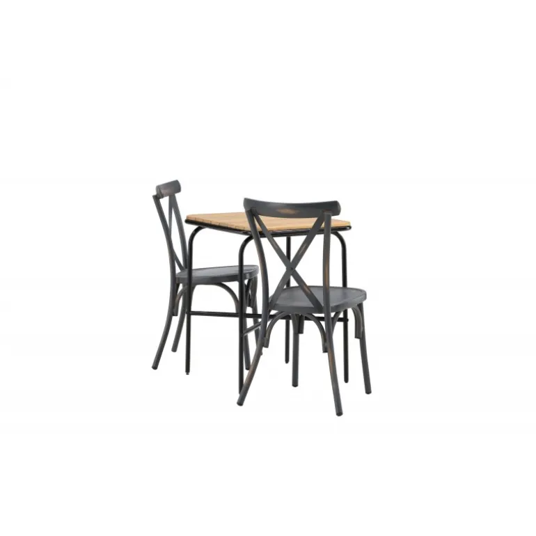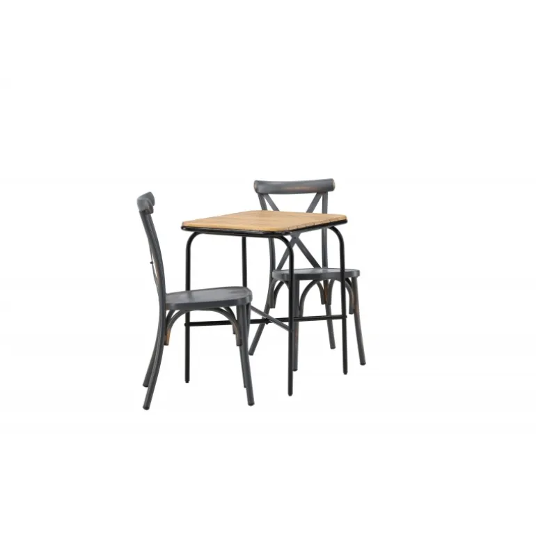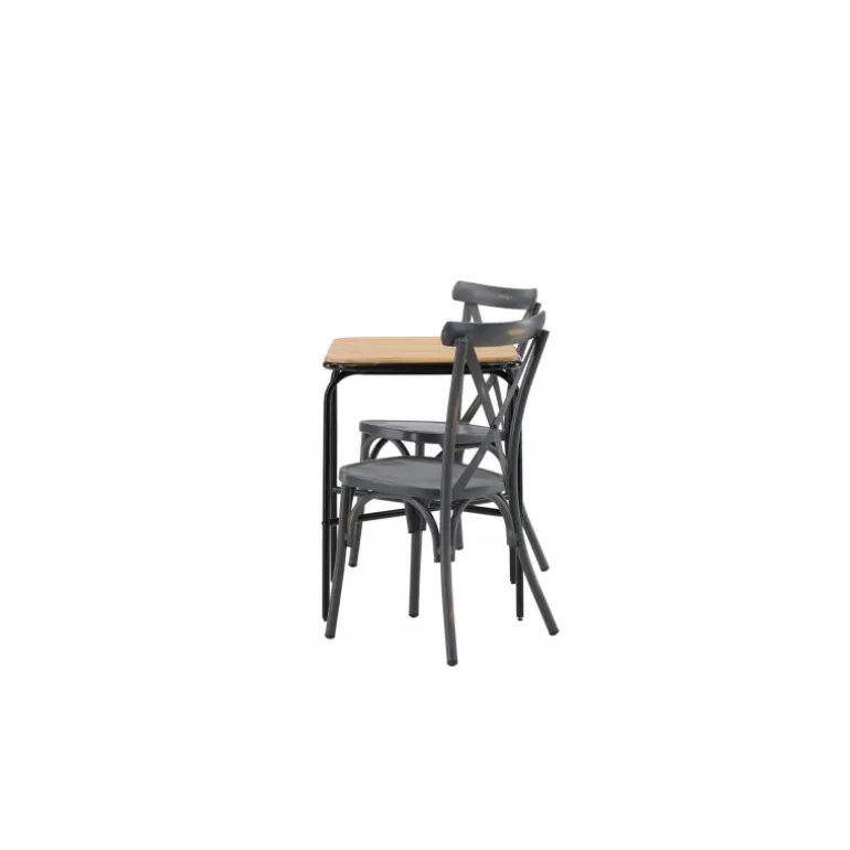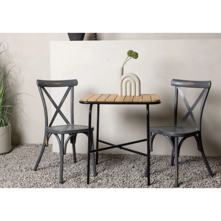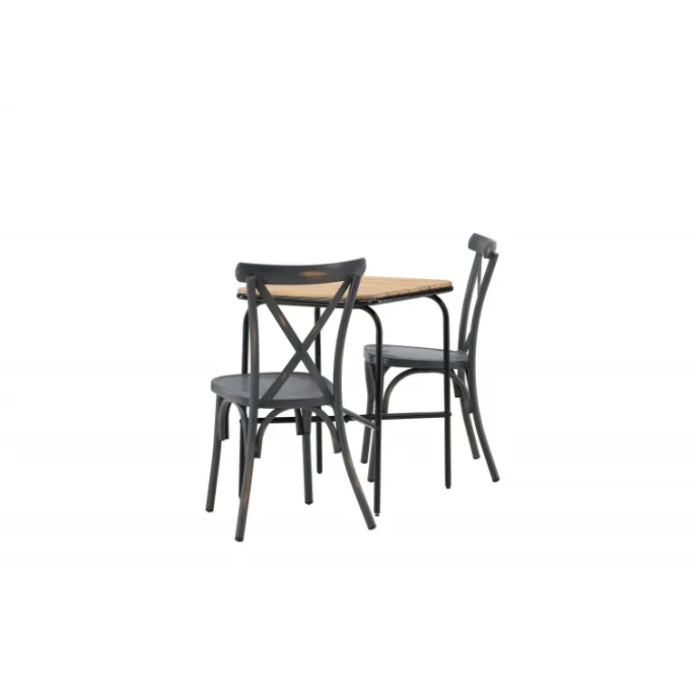 En cafégruppe med et gennemtænkt design! Vores stilfulde cafébord Holmbeck har en moderne, ribbet bordplade i akacietræ og en minimalistisk base i sort stål. Her sammen med 2 sorte spisebordsstole fra serien Tablas. Stolen har en industriel stil og er lavet af holdbart aluminium i en sodet sort farve. Her kan du nemt nyde stille øjeblikke og dejlige kaffepauser udendørs! Bordmål: 74x70x55cm.