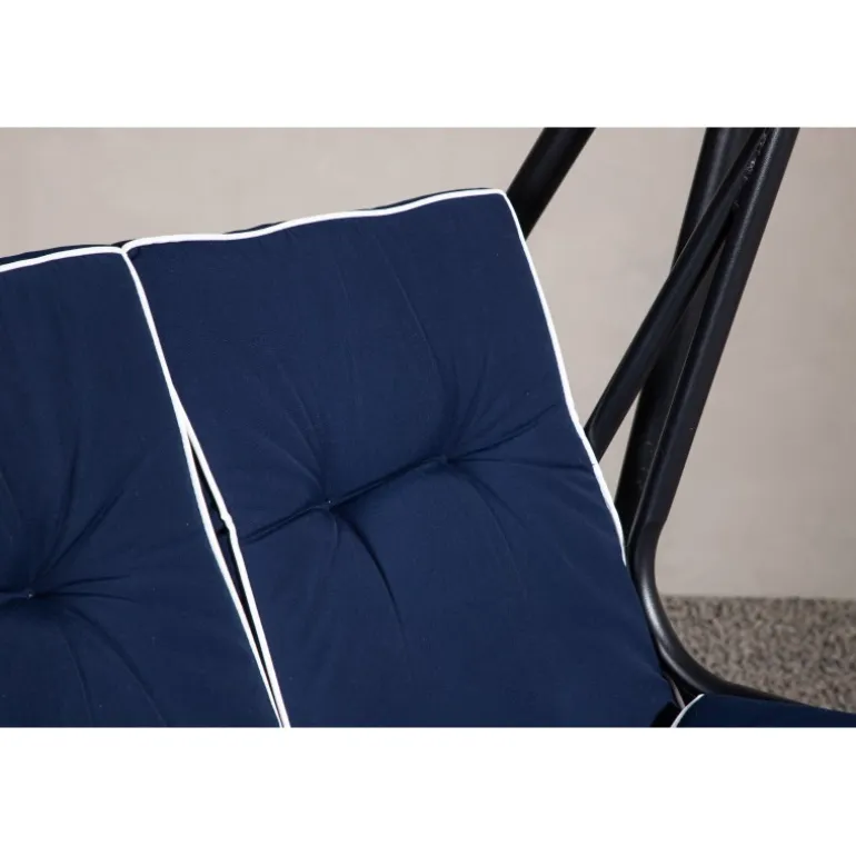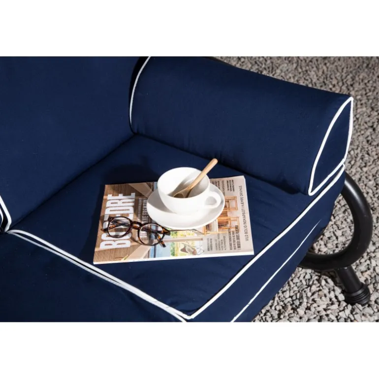 Blåt hyndesæt med 5-positioners pude og nakkepude samt stropper, der holder hynden på plads. Sid komfortabelt i mange timer. Fremstillet af skum og polyester, hvilket sikrer både komfort og holdbarhed. Perfekt til udendørs brug, men bør opbevares indendørs, når det ikke er i brug for at undgå skader og mug.