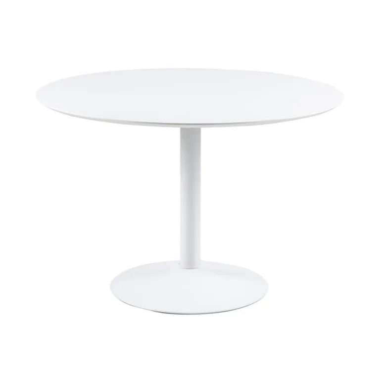 Flot moderne rundt spisebord med hvid bordplade i MDF på trompetfod i hvidlakeret metal.