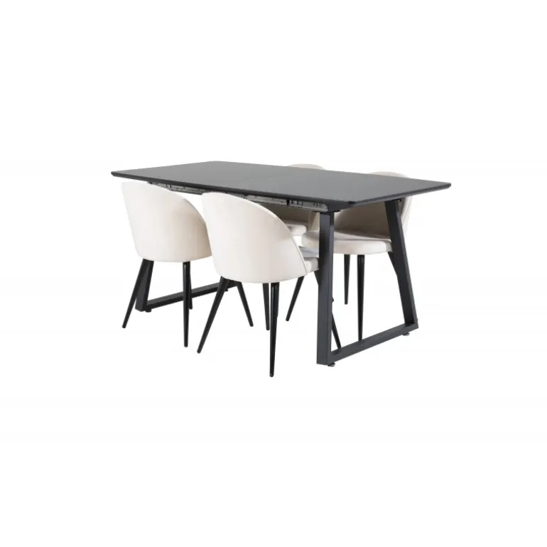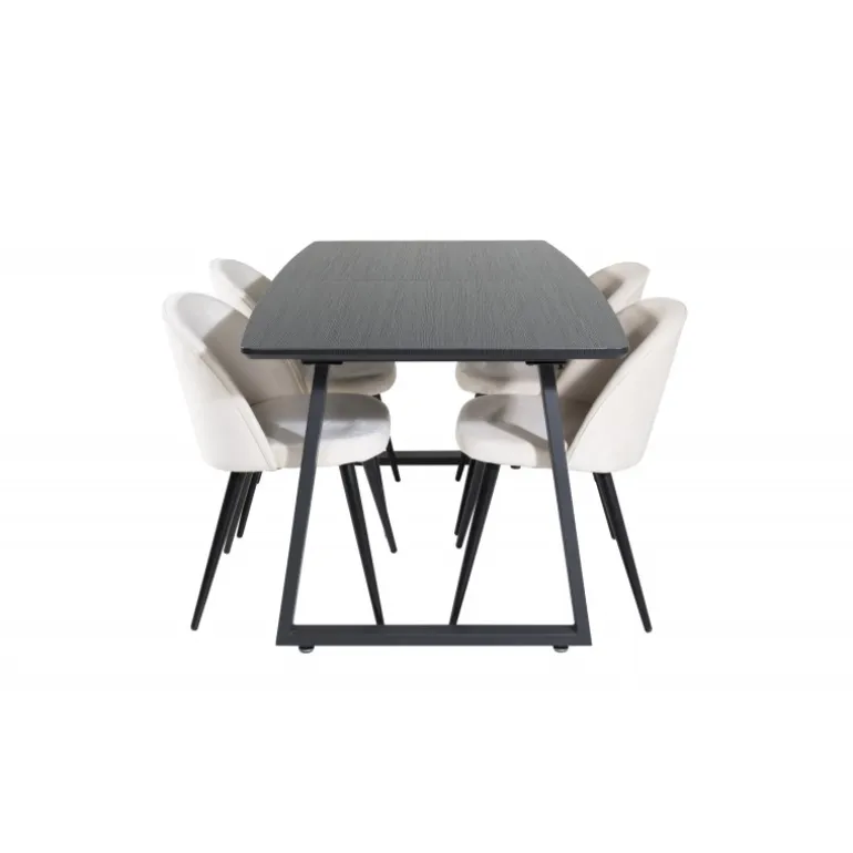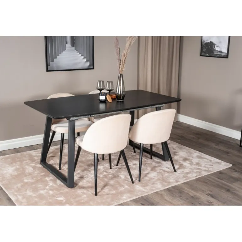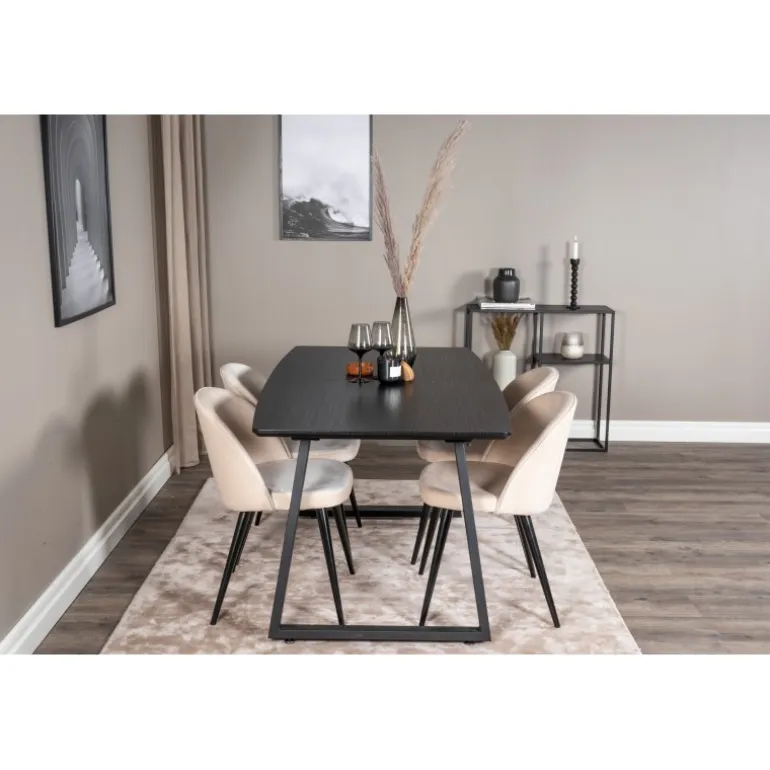 - Farvekombination: Elegant sort bord og beige stole, der passer til enhver indretning.