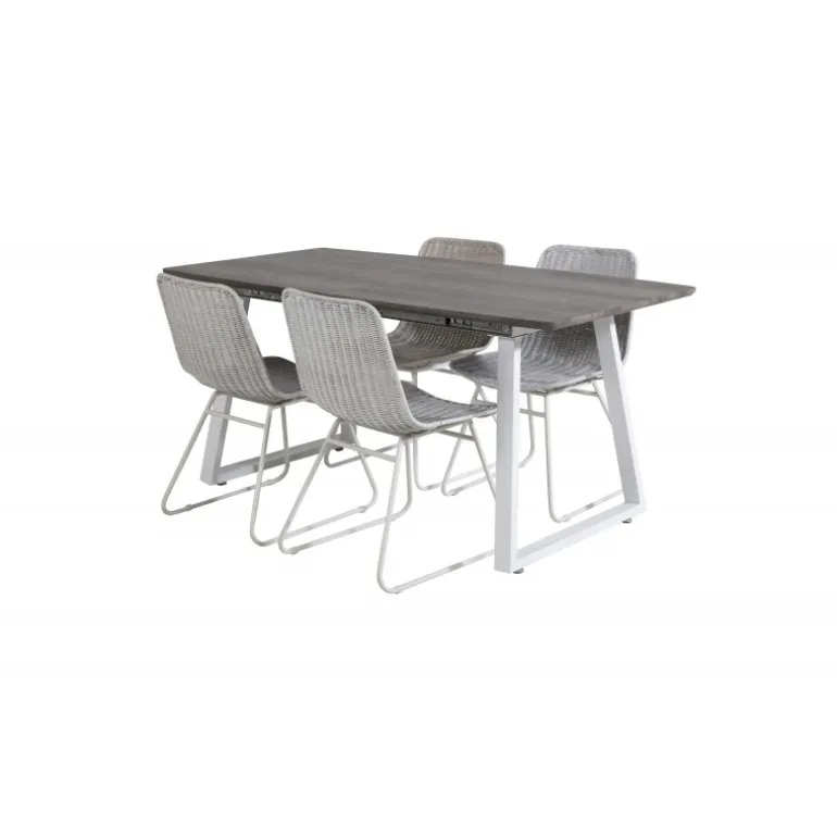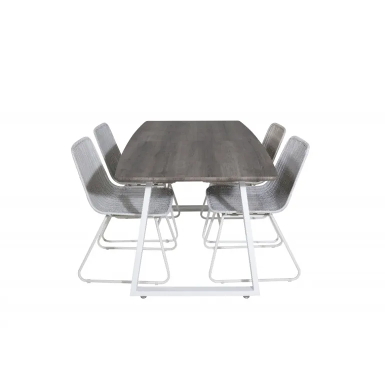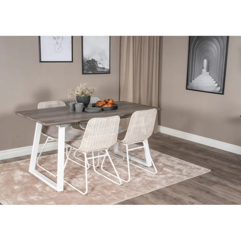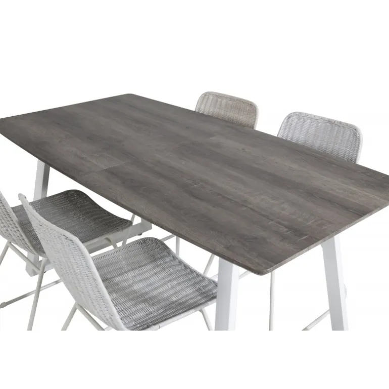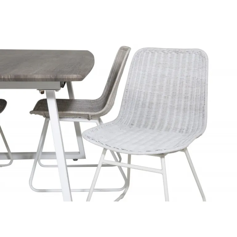 - Kvalitetsmaterialer: Bord i grå MDF og stål, stole i hvidt rattan og stål.