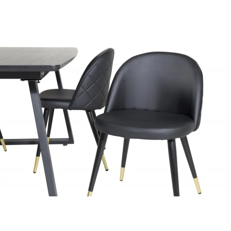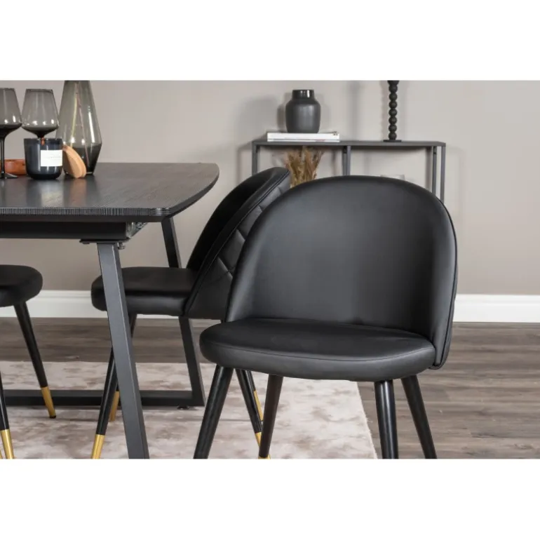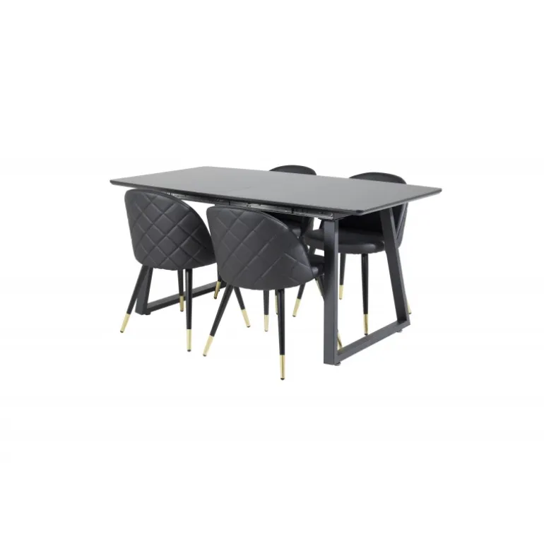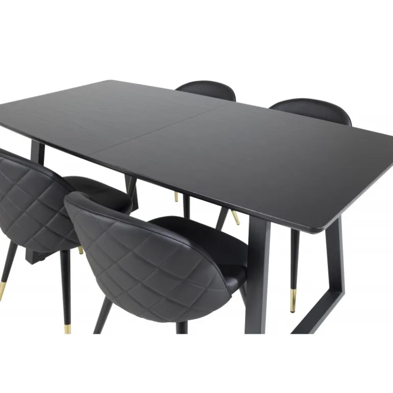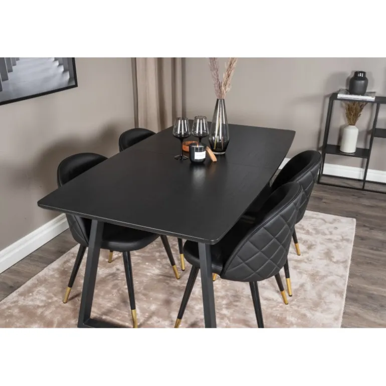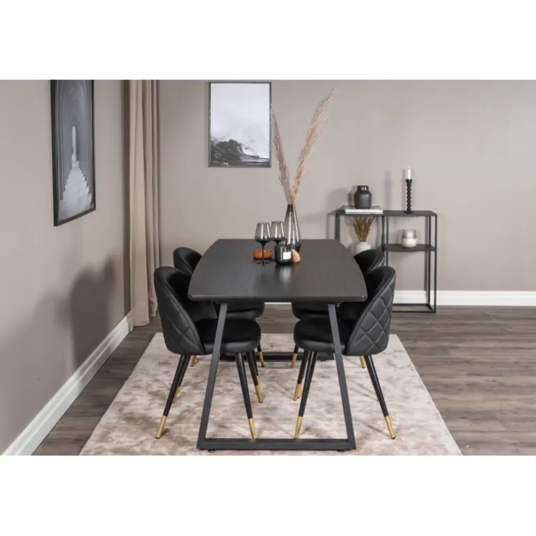 Klassisk madgruppe, der passer i de fleste husholdninger! Spisebordet Inca sammen med stole i Velvet-serien er som skabt til dem, der ønsker at skabe en hyggelig og moderne følelse i hjemmet. Inca Rektangulært Spisestuemøbel kombinerer elegant design med funktionalitet. Med sin sorte farve og materialer af høj kvalitet, er dette sæt både stilfuldt og holdbart. Det er ideelt til både daglig brug og særlige lejligheder.