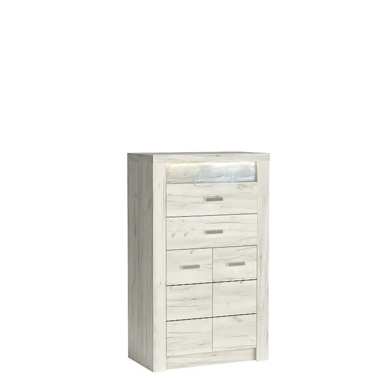 Oplev den moderne elegance og funktionalitet med INDIANAPOLIS kommode I6 i kraft hvid. Denne stilfulde kommode er ideel til at organisere dit hjem og give det et sofistikeret look. Med dimensionerne 76/42/127 cm passer den perfekt ind i enhver boligindretning. Du har også mulighed for at bestille LED-belysning separat for at tilføje et ekstra touch af luksus (JAR-INDIANAPOLIS-LED-BLAT). Fremstillet af lamineret spånplade for både krop og front, kantet med ABS-finer og en bagside af HDF-spånplade. Metalhåndtag og hængsler sikrer holdbarhed og lang levetid.
