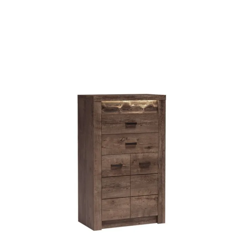 Opgrader dit hjem med INDIANAPOLIS kommode I6 i mørk asketræ, en elegant og funktionel opbevaringsløsning. Med dimensioner på 76/42/127 cm passer denne kommode perfekt ind i ethvert rum. Den er fremstillet af lamineret spånplade med kant i ABS finer, hvilket sikrer holdbarhed og et stilfuldt udseende. Der er også mulighed for at bestille LED-belysning separat for at give dit møbel et ekstra touch af luksus.