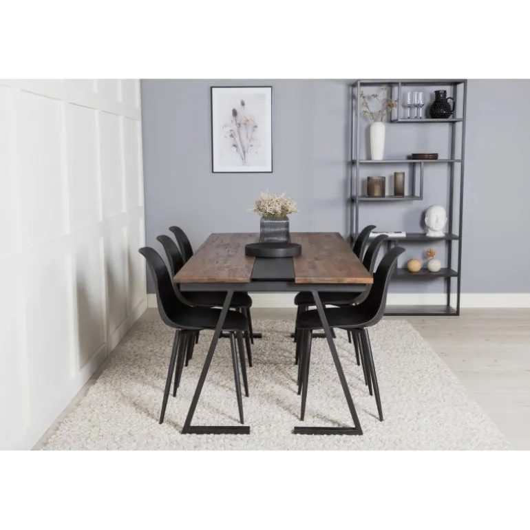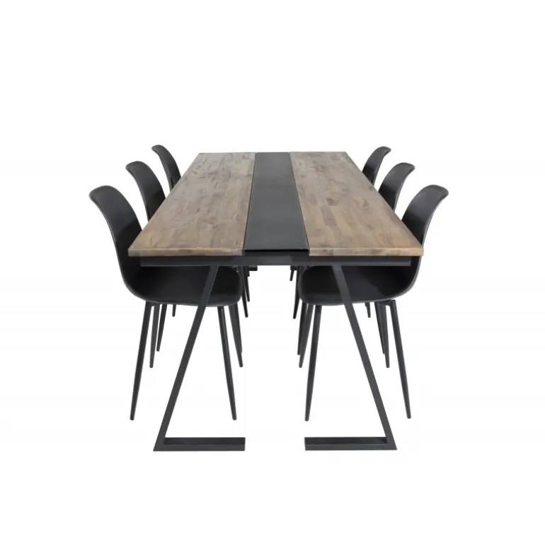 Dette spisebordssæt er både stilfuldt og tidløst i sin farveskala! Spisebordet Jakarta kombineret med spisestolene Polar giver en luksuriøs og elegant følelse – udvid dine middagsinvitationer uden bekymring for pladsproblemer. Lavet af høj kvalitet teaktræ, plastik, og stål, og kræver samling ved modtagelse. Fås i farverne sort og natur.
