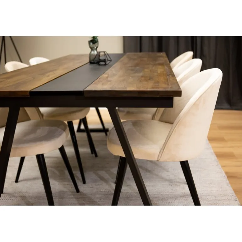 Kombinationen af forskellige farver og materialer skaber ofte en fantastisk succes. Med vores spisebord Jakarta og vores spisebordsstole i velour får du en kombination, der er moderne, hyggelig og tidløs! Dette sæt er perfekt til enhver spisestue og kombinerer teaktræ og stål for et elegant og robust design. Stolene er fremstillet af bøgetræ, skum og stål, og de tilbyder både komfort og stil.