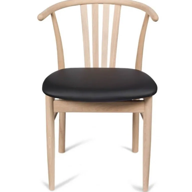 Denne Jane spisebordsstol har et klassisk og enkelt design med rene linjer og bløde former. Denne version af Jane stolen er udført i ubehandlet eg og har sæde polstret med sort ægte læder.