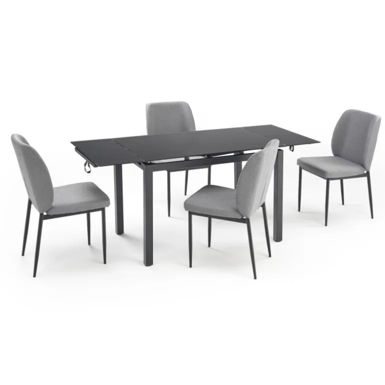 JASPER sæt bord + 4 Spisebordsstole er det perfekte valg til din spisestue. Dette elegante spisesæt kombinerer moderne design med funktionalitet. Bordet er justerbart, hvilket gør det ideelt til både små og store sammenkomster. Spisebordsstolene er komfortable og stilfulde, lavet af holdbare materialer som glas og pulverlakeret stål. Med sin Sorte og grå farve passer dette sæt ind i ethvert hjem og giver et sofistikeret touch til din indretning.
