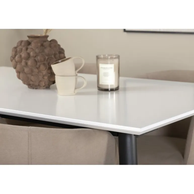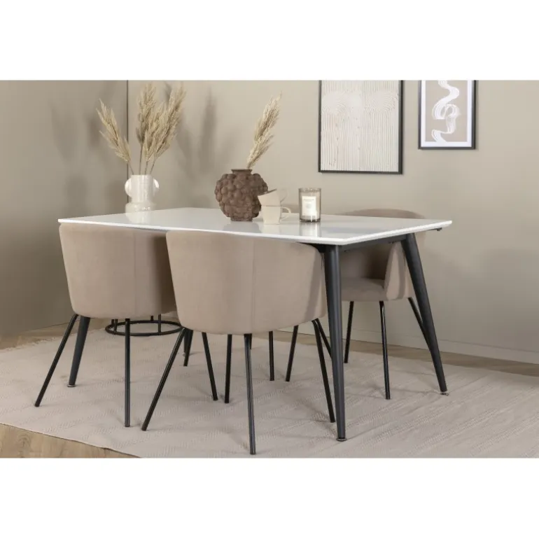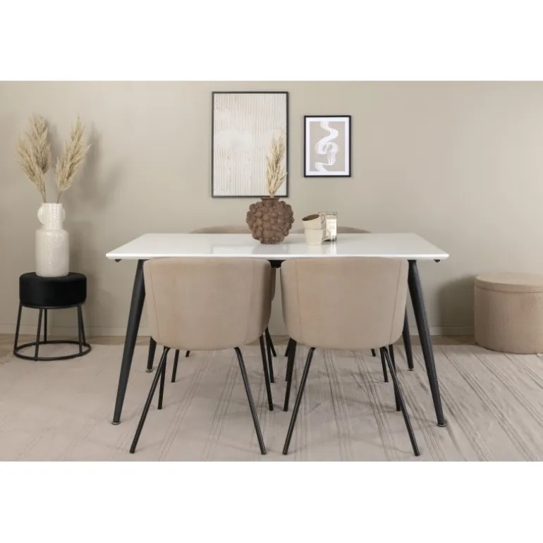 Vores populære spisebordsstole Berit i luksuriøst design forlænger de hyggelige middagsøjeblikke! Stolen har en generøs sædedybde med et sæde i beige fløjl og stilfulde smalle stoleben i sort jern. Stolens dimensioner: Højde: 78 cm, sædehøjde: 49 cm, bredde: 55 cm, dybde: 55 cm. Her matches 6 spisebordsstole med det klassiske spisebord Jimmy – et sikkert valg til alle anledninger! Med en udtrækkelig topplade i hvid HPL og MDF finer og let udadbuede ben i sort metal, passer dette bord perfekt til alle indretningsstile og hjem. Bordets dimensioner: Længde udtrækkelig mellem: 150 cm og 240 cm, bredde: 90 cm, højde: 76 cm.