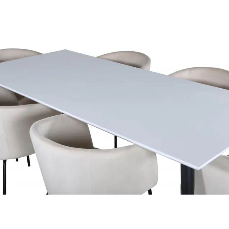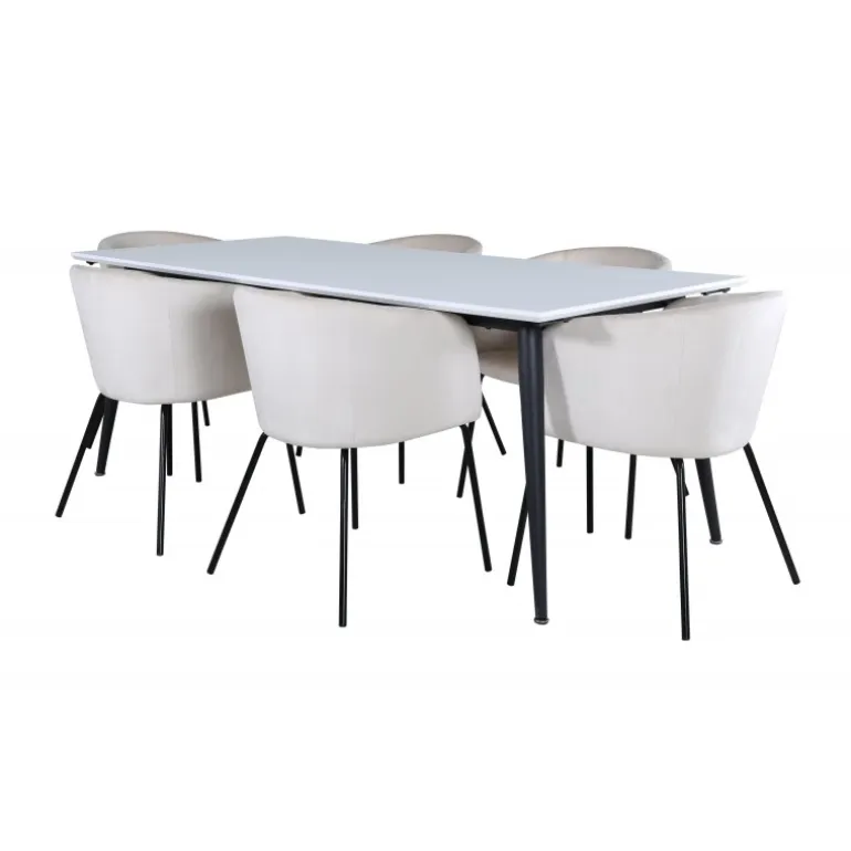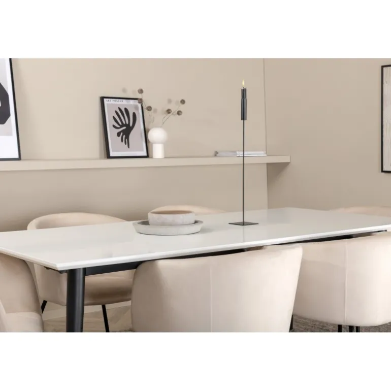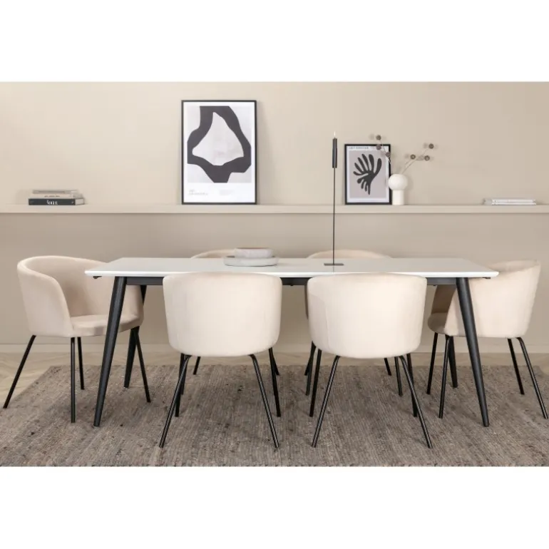 Vores populære spisestole Berit i luksuriøst design forlænger de hyggelige middagstunder! Stolen har en generøs sædedybde med et sæde i beige fløjl og stilfulde, smalle stoleben i sort jern. Stoldimensioner: Højde: 78 cm, sædehøjde: 49 cm, bredde: 55 cm, dybde: 55 cm. Her matches 6 spisestole med det klassiske spisebord Jimmy – et sikkert kort til alle lejligheder! Med en udtrækkelig topplade i hvid HPL og MDF finer samt let udstående ben i sort metal, passer dette bord perfekt til alle indretningsstile og hjem. Borddimensioner: Længde udtrækkelig mellem: 195 cm og 285 cm, bredde: 90 cm, højde: 76 cm.