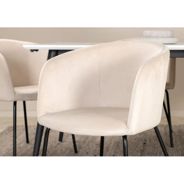 - Elegant Design: Luksuriøse Berit stole med beige fløjlsæde og smalle sorte jernben.