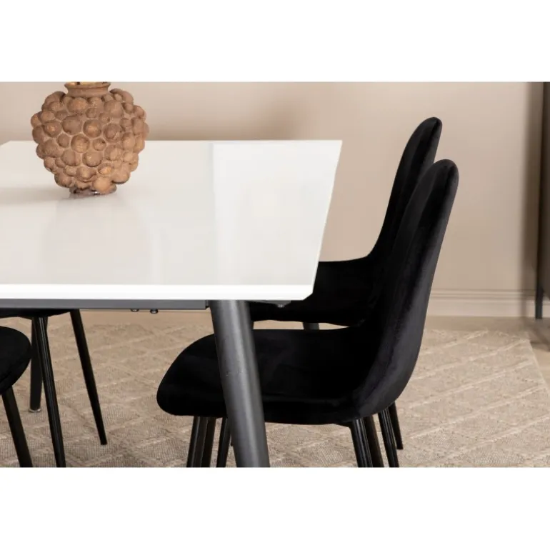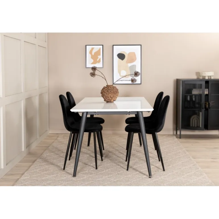 Med det klassiske og moderne spisebord Jimmy i skandinavisk design kan hele familien samles til middag og socialt samvær. Bordet er udtrækkeligt og har en hvid bordplade i HPL og MDF samt sorte, let skrånende bordben i jern. Bordets dimensioner: Længde udtrækkelig mellem 150cm og 240cm, bredde: 90cm, højde: 76cm. Her sammen med vores komfortable spisestole Polar med blød velour sæde og stel i sort metal. Stolens dimensioner: Højde: 88cm, sædehøjde: 41,5cm, bredde: 42,5cm, dybde: 53,3cm. Lad tiden ved spisebordet blive et af dagens højdepunkter!