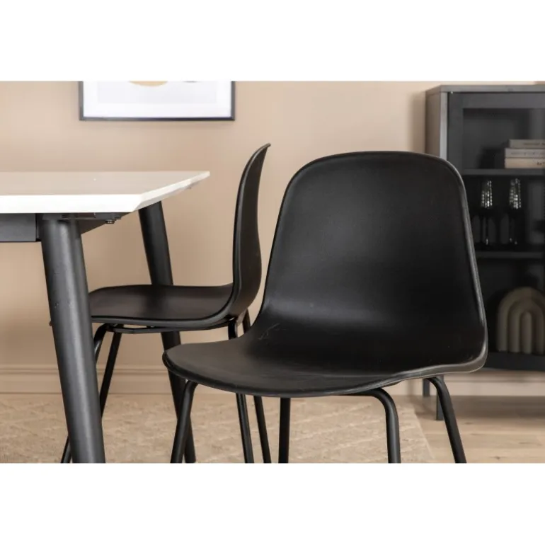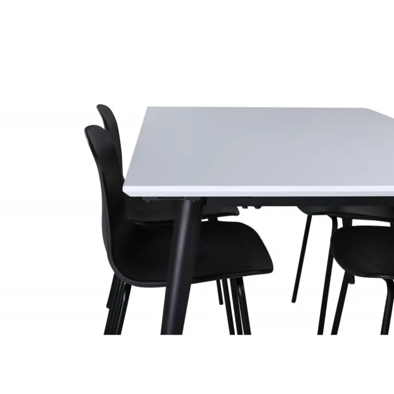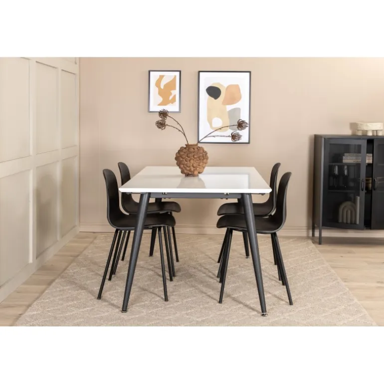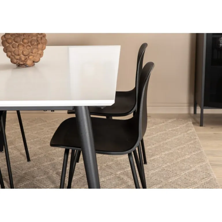 Giv hjemmets hjerte stilfuldt design og tidløse farver! Vores klassiske og moderne spisebord fra Jimmy-serien i skandinavisk design, hvor hele familien kan samles til middag og socialt samvær. Bordet er udtrækkeligt og har en hvid bordplade i HPL og MDF samt sorte, let udadgående bordben i jern. Borddimensioner: Længde udtrækkelig mellem: 150 cm og 240 cm, bredde: 90 cm, højde: 76 cm. Her i perfekt kombination med 6 Arctic spisebordsstole med metalstoleben og sorte sæder i plastik – lige så praktiske som pæne. Stoledimensioner: Højde: 82 cm, sædehøjde: 45 cm, bredde: 49 cm, dybde: 47,5 cm.