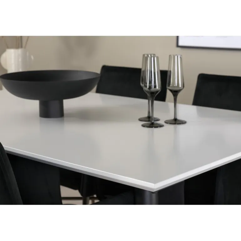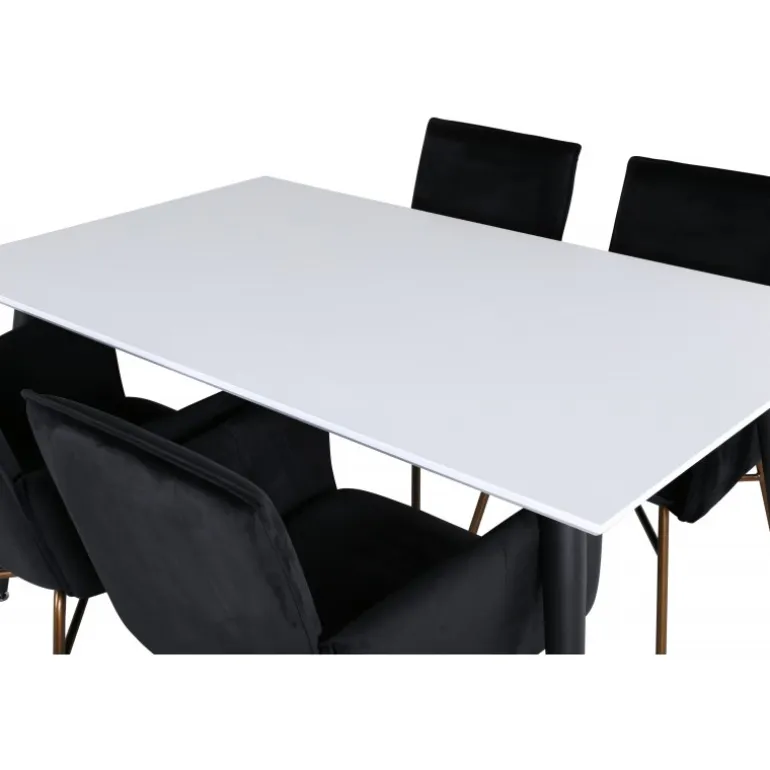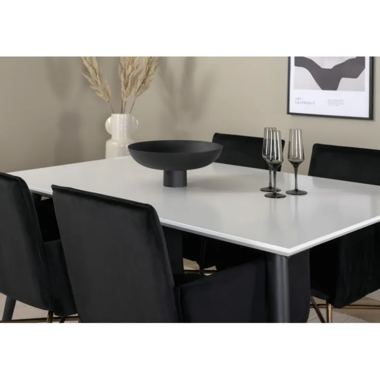 Klassisk, stilfuld og praktisk – Jimmy spisestuesæt er et sikkert valg til alle lejligheder! Med en udtrækkelig topplade i hvid HPL og MDF finer samt let skrånende ben i sort metal, passer dette bord perfekt til alle indretningsstile og hjem. Bordmål: Længde udtrækkelig mellem: 150 cm og 240 cm, Bredde: 90 cm, Højde: 76 cm. Matchet her med 6 Petra spisebordsstole i luksuriøst design. Den indbydende sæde er i sort fløjlstof, og stolbenene er dekorative i kobberfarvet jern. Stolemål: Højde: 87 cm, Sædehøjde: 48 cm, Bredde: 57 cm, Dybde: 60 cm. Her sidder du og dine gæster komfortabelt i timevis!