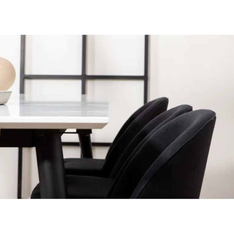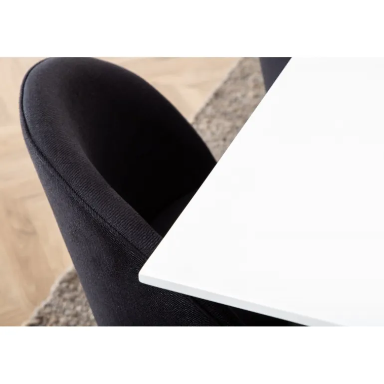 Med det klassiske og moderne Spisebordssæt Jimmy i skandinavisk design kan hele familien samles til middag og socialt samvær. Bordet er udtrækkeligt og har en hvid bordplade i HPL og MDF samt sorte, let skrånende bordben i jern. Bordmål: Udtrækkelig længde mellem 195 cm og 285 cm, bredde: 90 cm, højde: 76 cm. Her er det perfekt matchet med 6 velour-spisebordsstole med sorte metalben og sorte sæder i polyester. Stolemål: Højde: 76,5 cm, sædehøjde: 46,5 cm, bredde: 50 cm, dybde: 57 cm. Spisebordssættets gennemgående hvide og sorte farver er både tidløse og stilfulde og lette at matche med anden indretning!