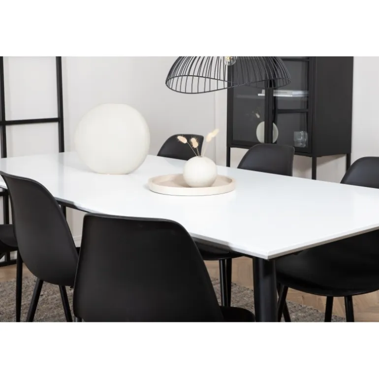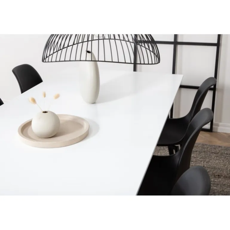 Indret stuen med et familievenligt Spisebordssæt med en moderne fornemmelse! Spisebordet Jimmy har et klassisk, rektangulært design i de matchende farver hvid og sort. Bordet har et skandinavisk design med en bordplade i hvid HPL og MDF og sorte, let udfladede, jernben. Bordmål: Længde udvidelig mellem: 195cm og 285cm, bredde: 90cm, højde: 76cm. Her er bordet matchet med 6 spisestole fra Polar-serien, som har en ensartet sort farve. Stolens sæde er i praktisk plastmateriale og stolens ben i jern. Stolemål: Højde: 81cm, sædehøjde: 46cm, bredde: 45,5cm, dybde: 58cm. Udvid dine middagsinvitationer og nyd en behagelig middag sammen med dine kære.