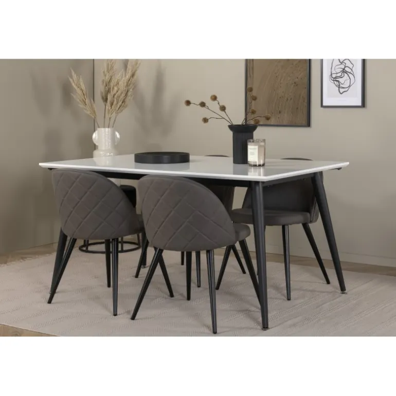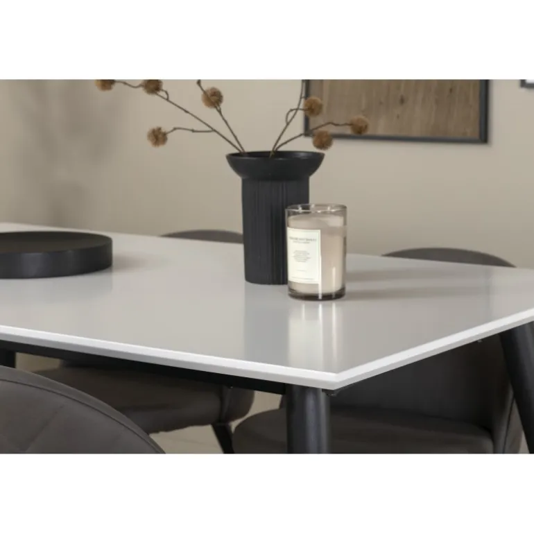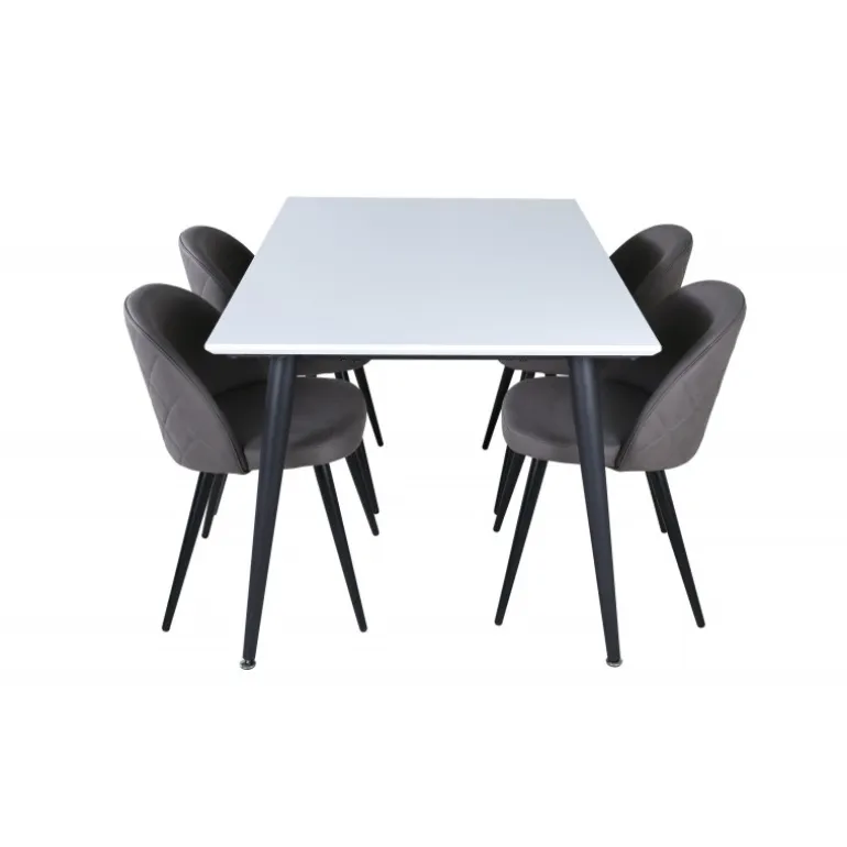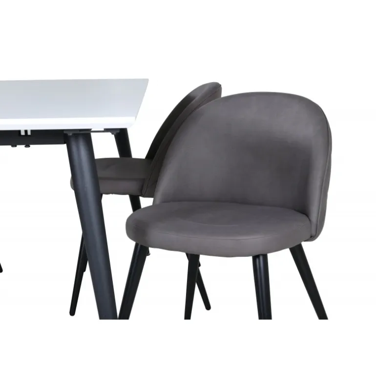 Skab en hjemlig og indbydende atmosfære i hjertet af dit hjem! Jimmy spisestuebord er et sikkert valg til alle lejligheder. Med en udtrækkelig topplade i hvid HPL og MDF finer samt let skrånende ben i sort metal passer dette bord perfekt til alle indretningsstile og hjem. Bordmål: Længde udtrækkelig mellem: 150cm og 240cm, bredde: 90cm, højde: 76cm. Her i perfekt kombination med 4 af vores populære Velvet Stitches spisestuestole. De sorte metalben på stolen er skrånende i skandinavisk design, og sæderne i grå mikrofiber har stilfulde dekorationssømme på ryggen. Stolens mål: Højde: 76,5cm, sædehøjde: 46,5cm, bredde: 50cm, dybde: 57cm.