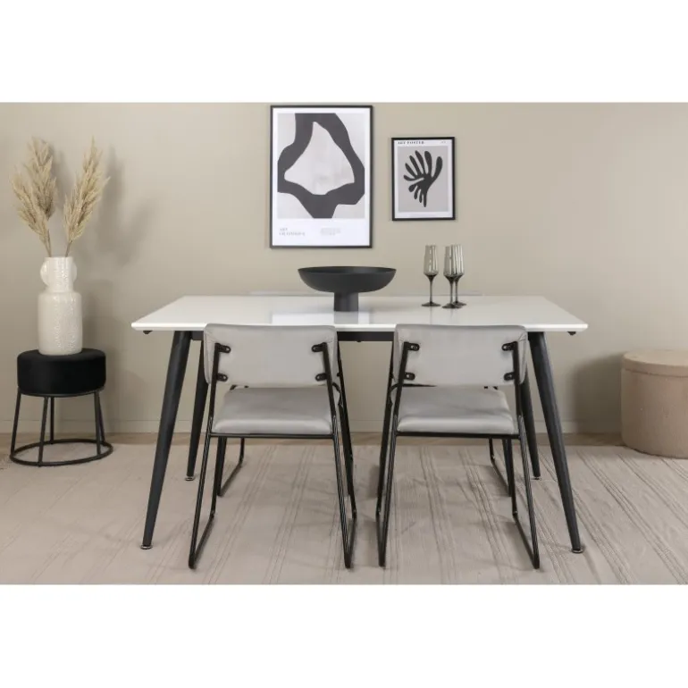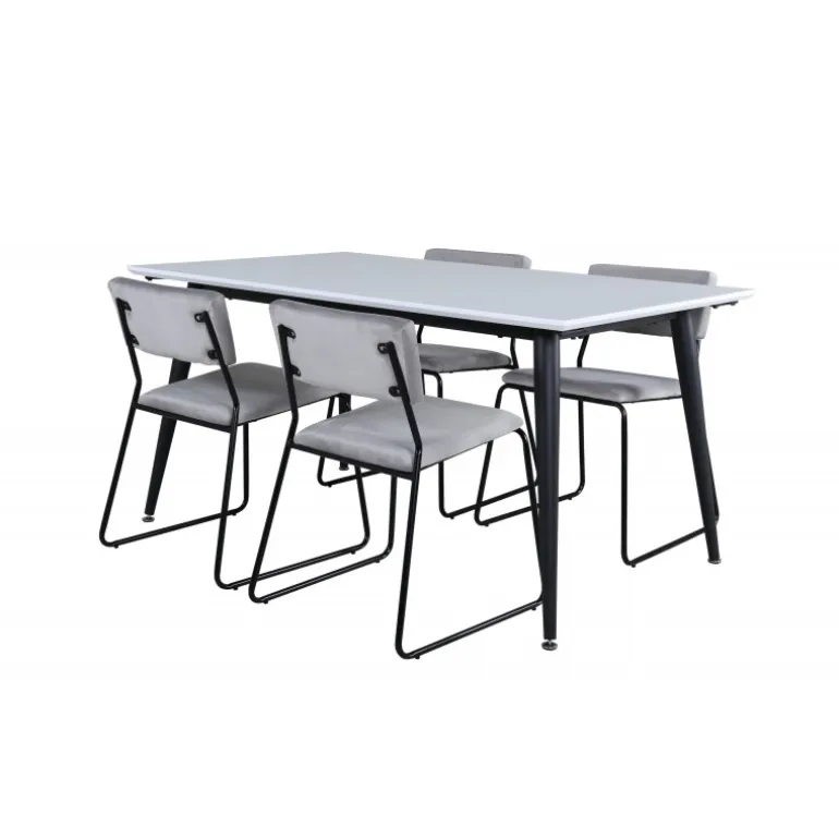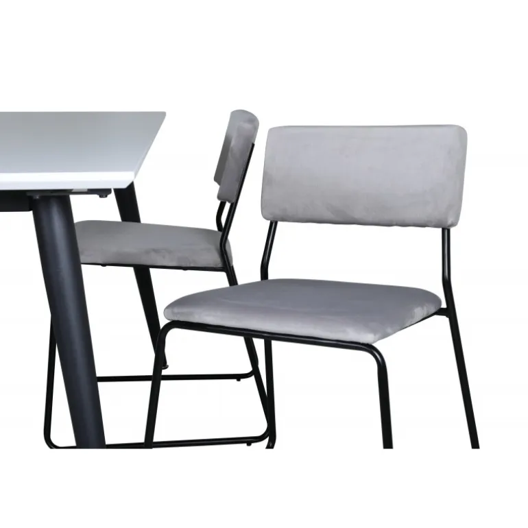 Minimalistisk og stilfuldt – et Spisebordssæt til alle anledninger! Jimmy spisebordet har en udtrækkelig bordplade i hvid HPL og MDF finer og let skrånende ben i sort metal, et klassisk look der gør dette bord perfekt til alle interiørstile og hjem. Bordets dimensioner: Længde udtrækkelig mellem: 150 cm og 240 cm, bredde: 90 cm, højde: 76 cm. Her sammen med 4 Kenth spisebordsstole i flot design. Stolens ben er stilfuldt smalle i sort jern, og sæderne er komfortable i grå fløjl. Stolens dimensioner: Højde: 76 cm, sædehøjde: 48,5 cm, bredde: 40 cm, dybde: 52 cm.