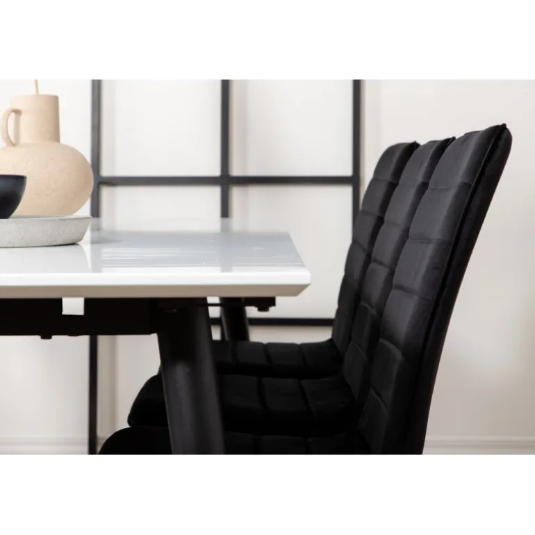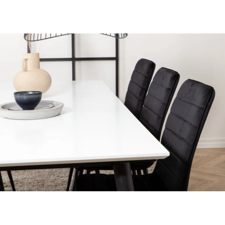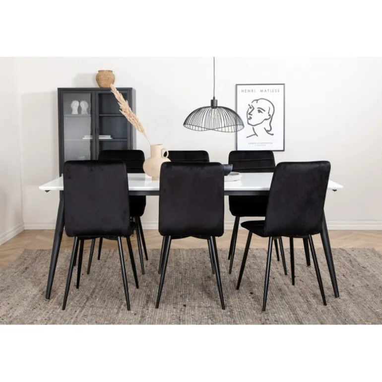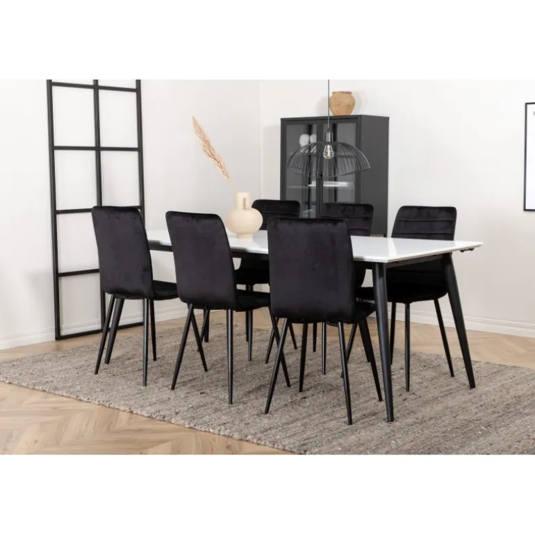 Vores klassiske og moderne spisebord fra Jimmy-serien i skandinavisk design, som hele familien kan samles omkring til middag og socialt samvær. Bordet er udtrækkeligt og har en hvid bordplade i HPL og MDF samt sorte, let udadbuede bordben i jern. Bordets dimensioner: Længde Udtrækkelig mellem: 195 cm og 285 cm, bredde: 90 cm, højde: 76 cm. Her i en lækker kombination med 6 Windu luksus spisebordsstole med sorte stolben i jern og sorte sæder af blødt velour stof. Stolens dimensioner: Højde: 94 cm, sædehøjde: 47 cm, bredde: 43 cm, dybde: 49 cm. Stolens høje siddekomfort inviterer til lange og vidunderlige øjeblikke for socialt samvær!