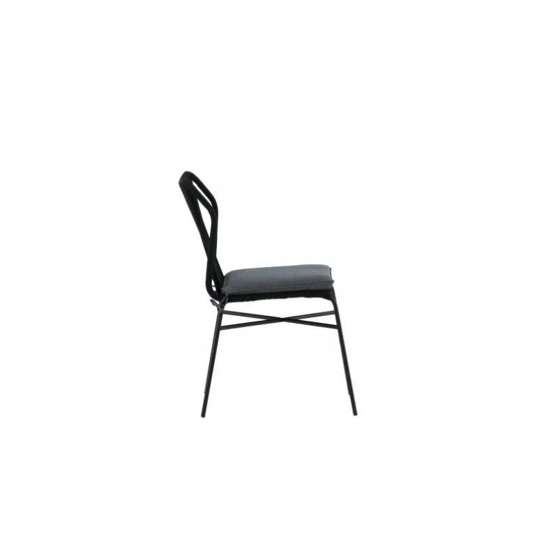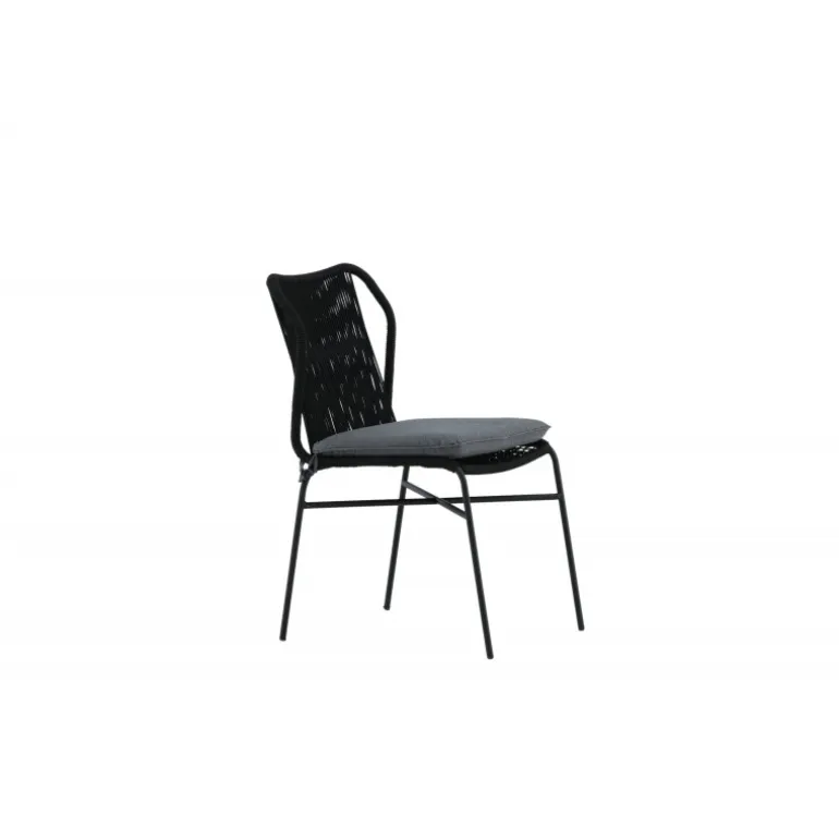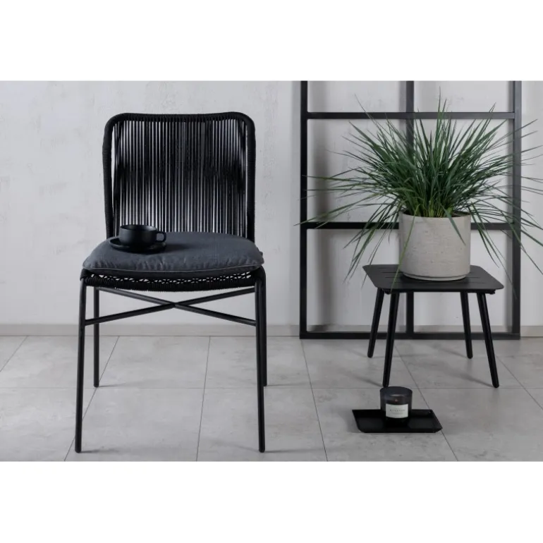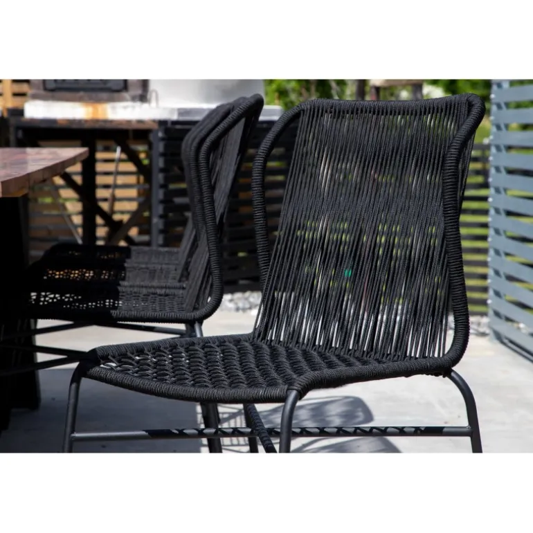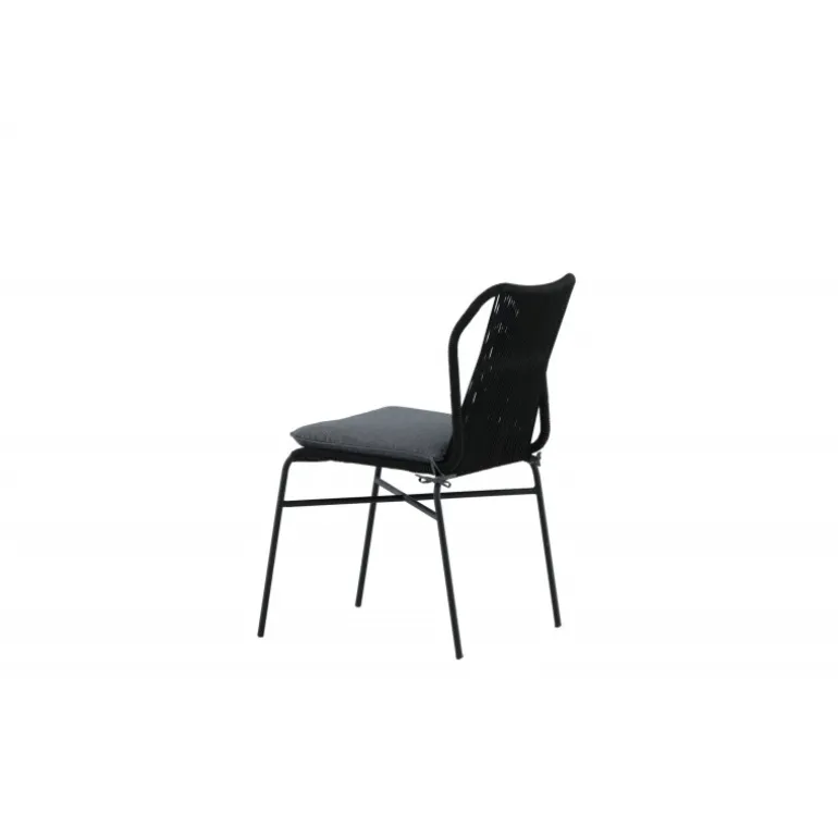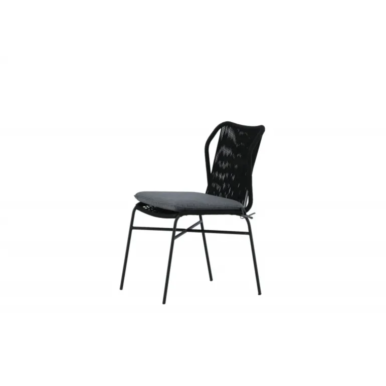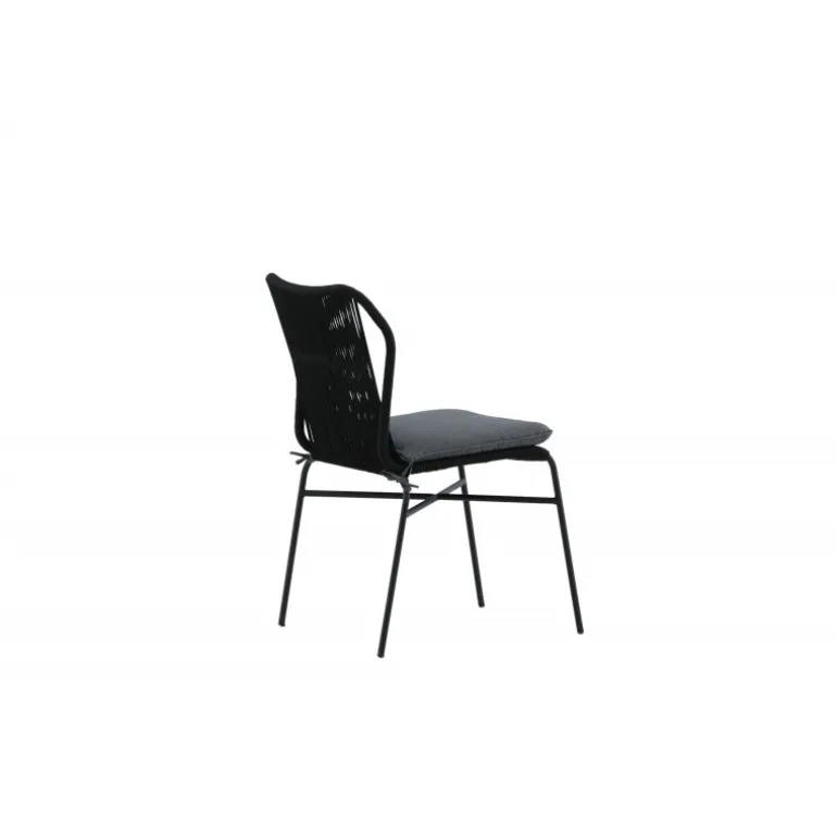 Julian spisestol er en stilfuld og robust stol, der tilføjer et ekstra touch til din udendørs indretning. Lavet af holdbart sort reb og aluminiumsramme, passer denne stol perfekt sammen med både sorte og træfarvede møbler. Stolen er stabelbar, hvilket gør den praktisk og pladsbesparende. Nyd udendørslivet denne sommer med Julian spisestol. Vaskeanvisning: Vores reb er lavet af kvalitets-spundet polyester, der er let at rengøre. Brug sæbe og vand til rengøring og lad tørre i luften. Til sværere tilgængelige områder kan en lille børste anvendes forsigtigt. Brug aldrig højtryksrenser eller stærke kemikalier på rebet.