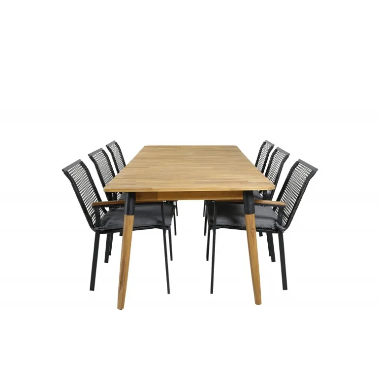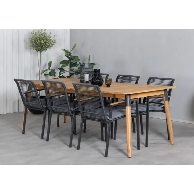 Nyd sommerens nætter med dette smarte og holdbare Loungesæt – Havemøbelsæt! Det rektangulære bord Julian i akacietræ kombineres med de stilfulde Dallas stole i sort reb. Skab en moderne og luksuriøs atmosfære i din udendørs plads med dette sæt, der har plads til mange gæster. Perfekt til både festlige anledninger og hyggelige måltider under åben himmel.