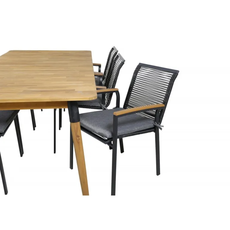 - Holdbart materiale: Bord i høj kvalitets akacietræ og stole i robust sort reb.