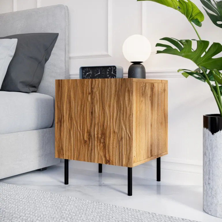 Oplev den perfekte kombination af stil og funktionalitet med JUNGLE natbordet. Dette sæt på 2 natborde er fremstillet af høj kvalitet materialer som mat lamineret spånplade og MDF-plade beklædt med folie, hvilket giver dem et elegant og moderne look. De synlige snit og wotan eg-kantning tilføjer en rustik charme, mens metalbenene sikrer holdbarhed. Med PUSH-CLICK systemet kan du nemt åbne og lukke skufferne uden håndtag. Perfekt til at tilføje et touch af sofistikation til dit soveværelse.