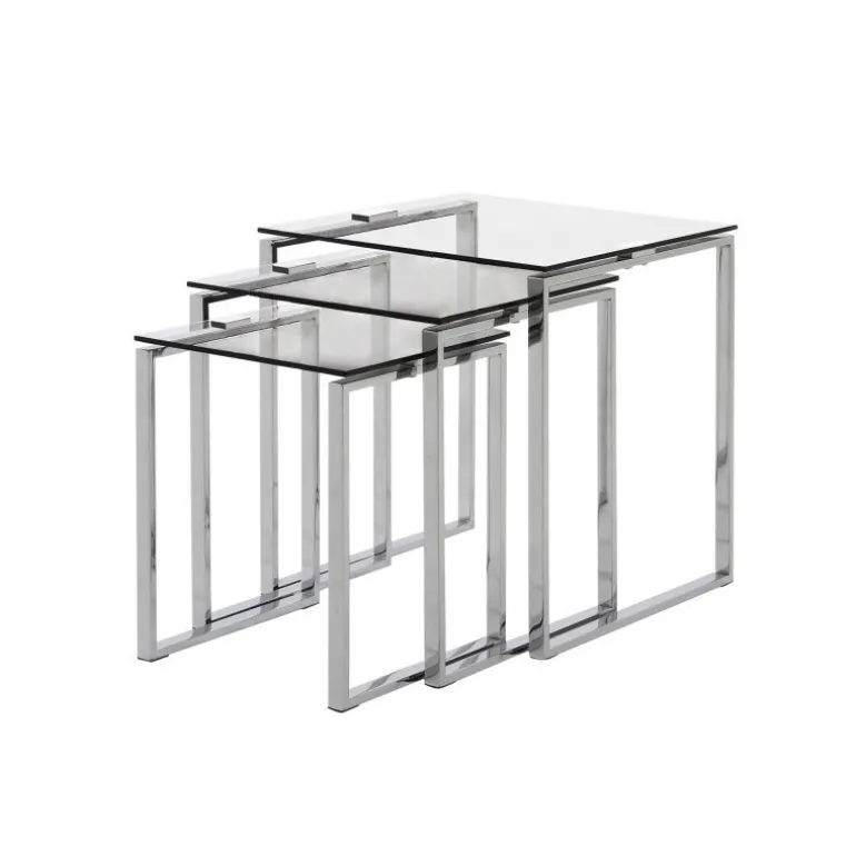 Sæt af 3 kvadratiske indskudsborde med glastoppe og stel i krombelagt metal. Bordene kan anvendes hver for sig eller sammen i forskellige kombinationsopstillinger.