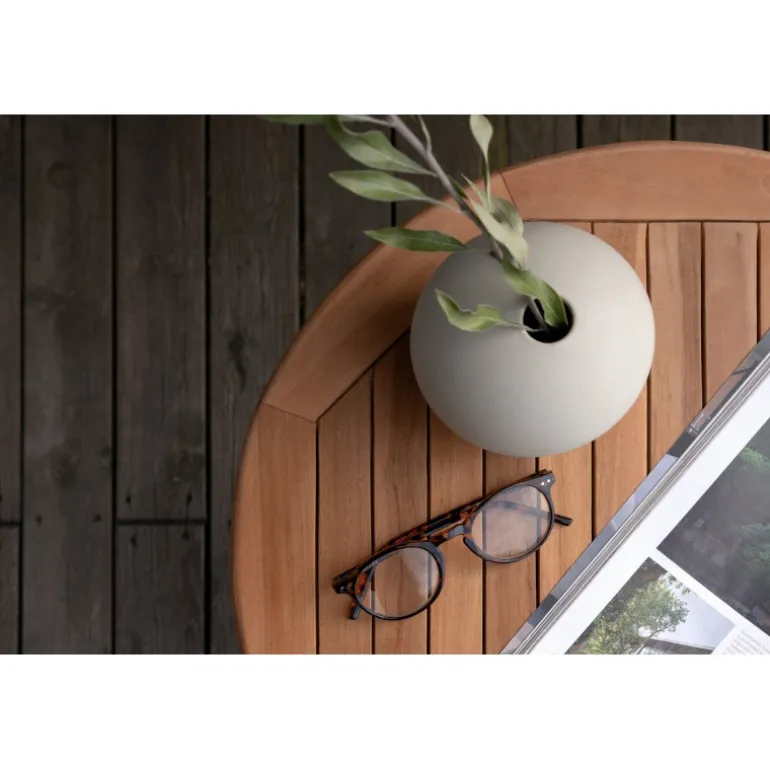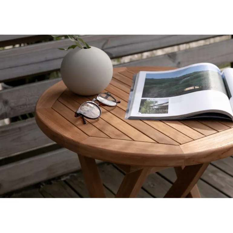 Det perfekte cafébord til sommermorgenmad eller solrige kaffepauser. Kenya er et rundt cafébord i stilfuld teak. Lige så praktisk som iøjnefaldende, giver bordet et indbydende indtryk og vil helt sikkert pryde sommeraftenerne. Følg vores vedligeholdelsesråd for tips til, hvordan du får dit bord til at holde længe. Vores teakmøbler er produceret af certificeret teak, der dyrkes med henblik på møbelproduktion og ikke fra udsatte regnskove. Som en af de mest holdbare træsorter indeholder teak meget olie, hvilket forhindrer materialet i at revne. Da træsorten naturligt indeholder meget olie, behøver møblerne ikke at blive imprægneret så ofte.