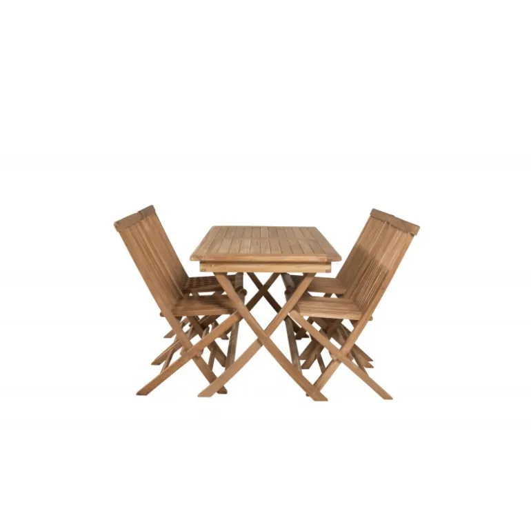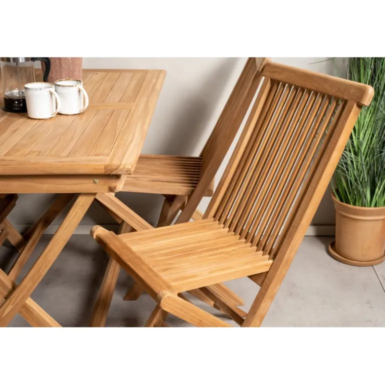 En trendfast Loungesæt – Havemøbelsæt i skandinavisk design! Vores populære, rektangulære spisebord Kenya har et tidløst design med ribbet version i smagfuld teak. Krydsbenene giver et stabilt og charmerende indtryk. Mål: 120×70 cm. Her i slank kombination med 4 lækre spisebordsstole fra samme serie. Stolene er også i teak og er sammenklappelige for praktisk opbevaring. Indret terrassen indbydende og skab et blikfang, der imponerer!
