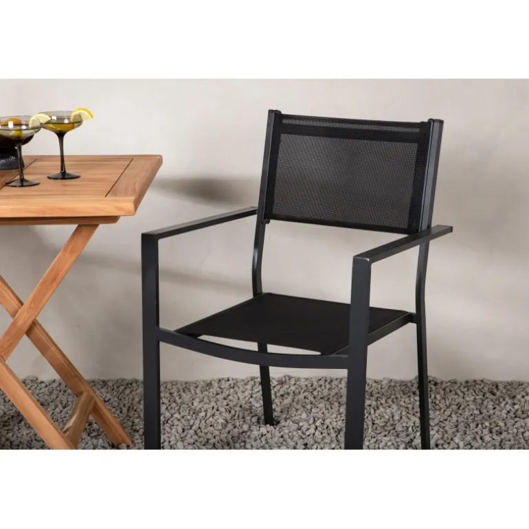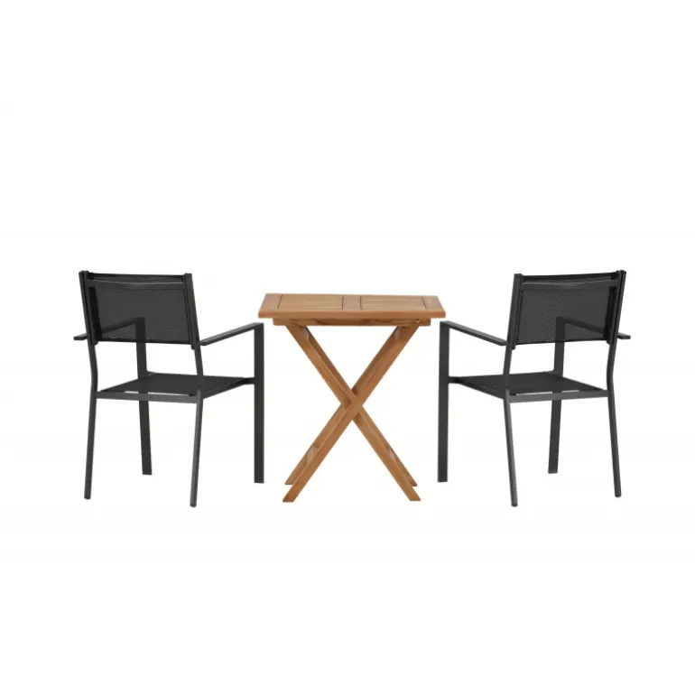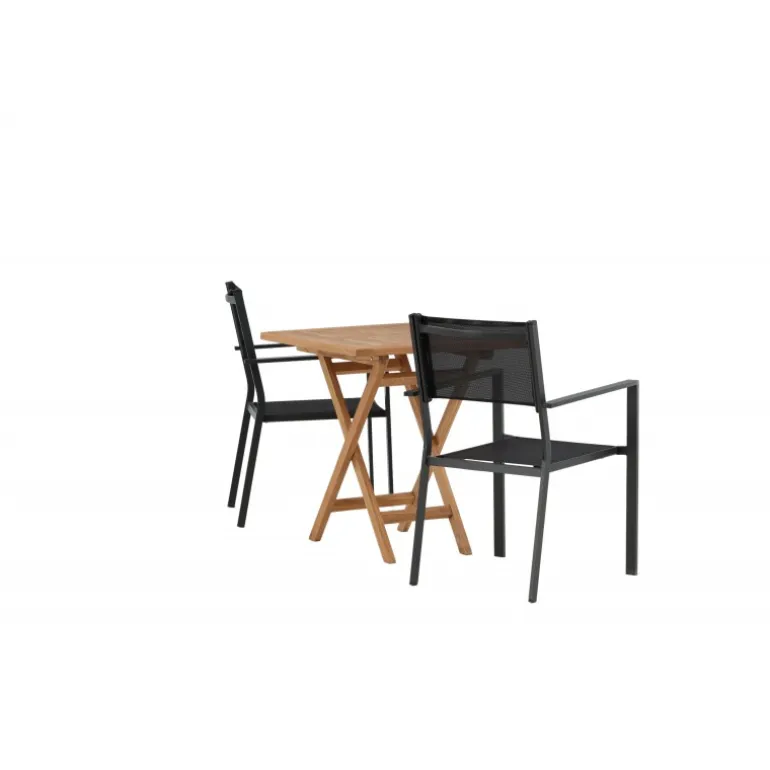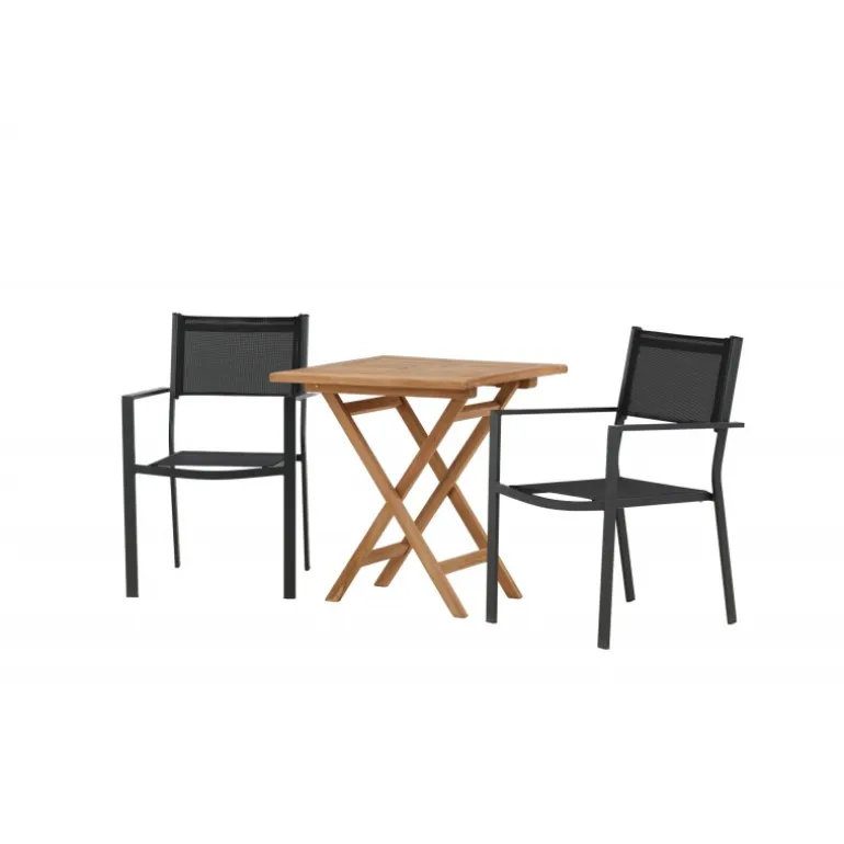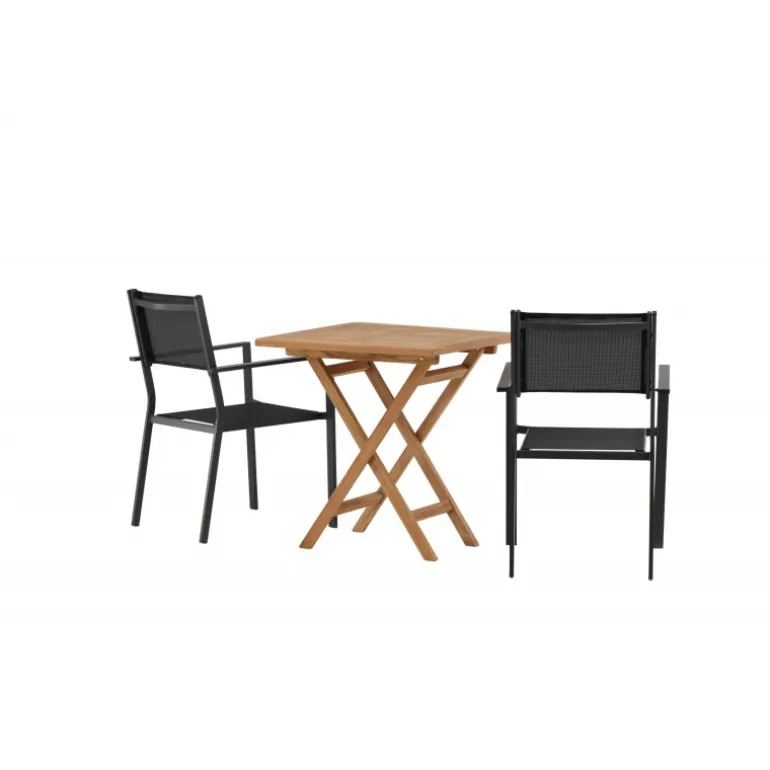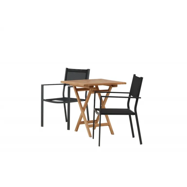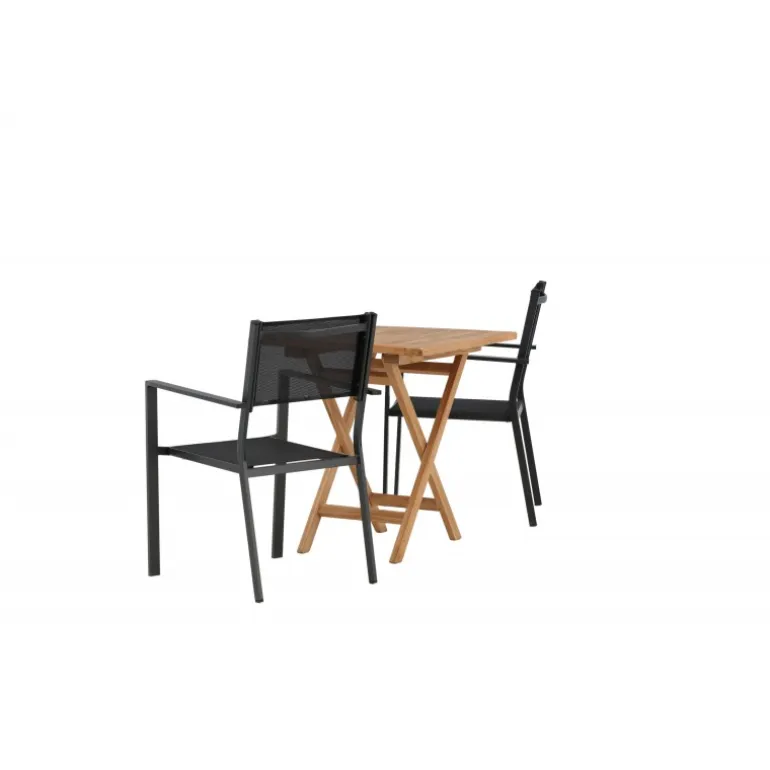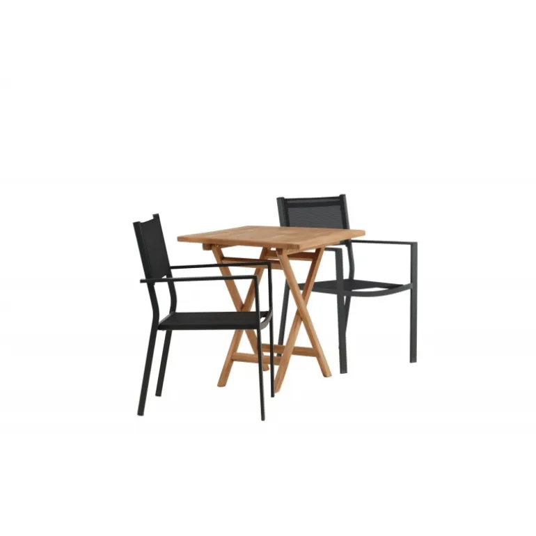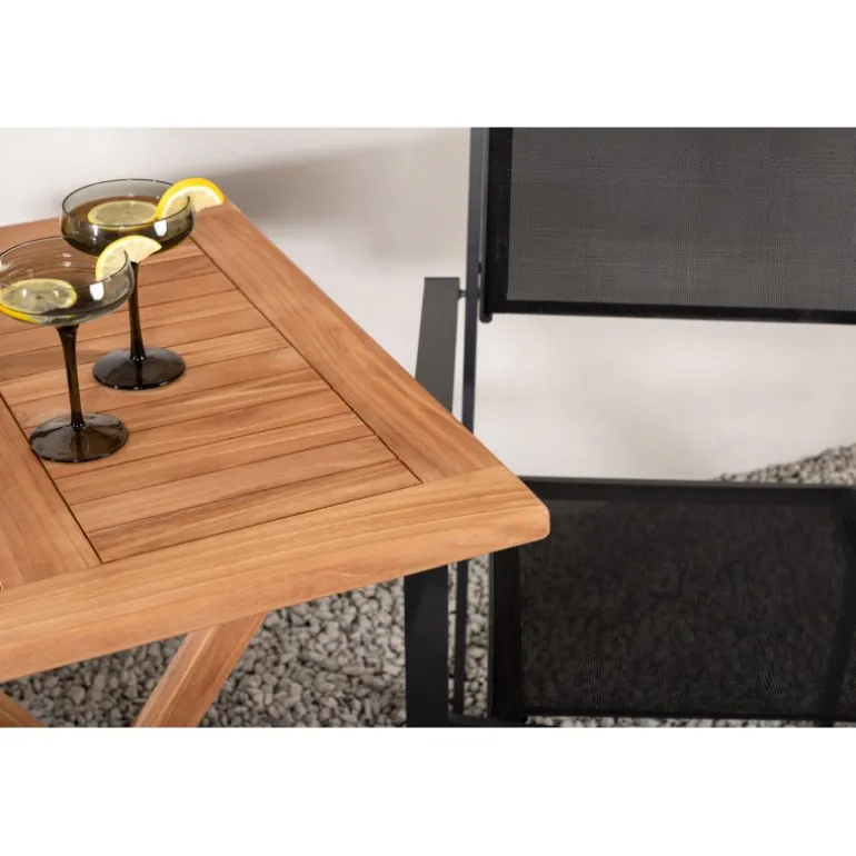 - Holdbare materialer: Bord i teaktræ og stole i aluminium og tekstil.