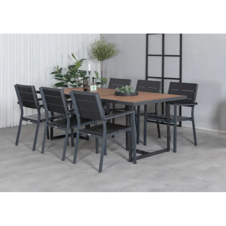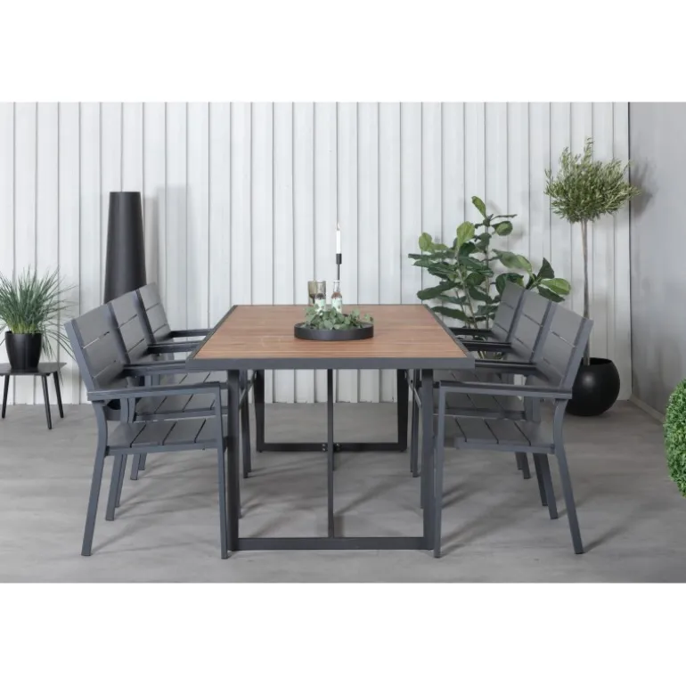 Oplev det perfekte udendørs Loungesæt – Havemøbelsæt med Khung Rektangulært Loungesæt – Havemøbelsæt. Dette moderne og stilfulde Loungesæt – Havemøbelsæt kombinerer Khung spisebord og Levels spiseborde, og skaber en indbydende atmosfære i din have. Spisebordet er lavet af holdbart akacietræ og stål, mens spisestolene er fremstillet af aintwood og aluminium. Med sin elegante naturfarve og sorte detaljer passer dette sæt perfekt til enhver udendørs indretning. Det kræver montering og kommer i 4 pakker.