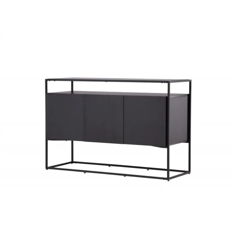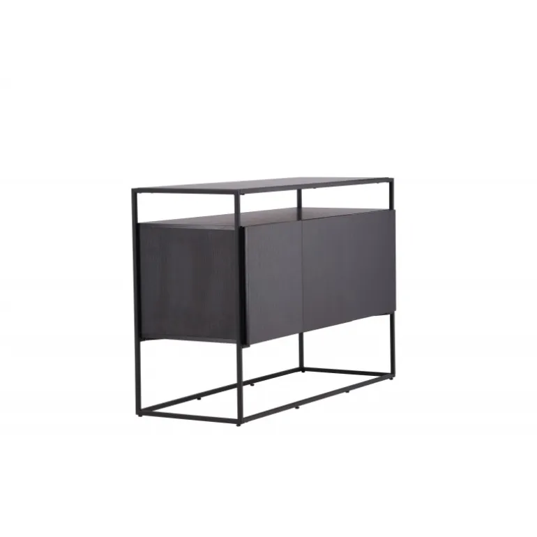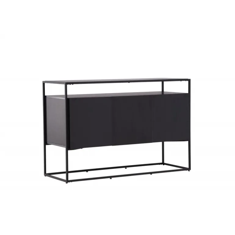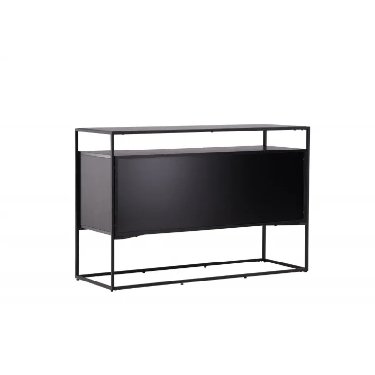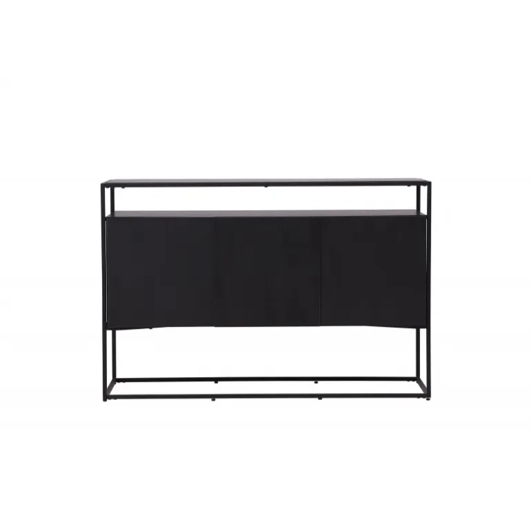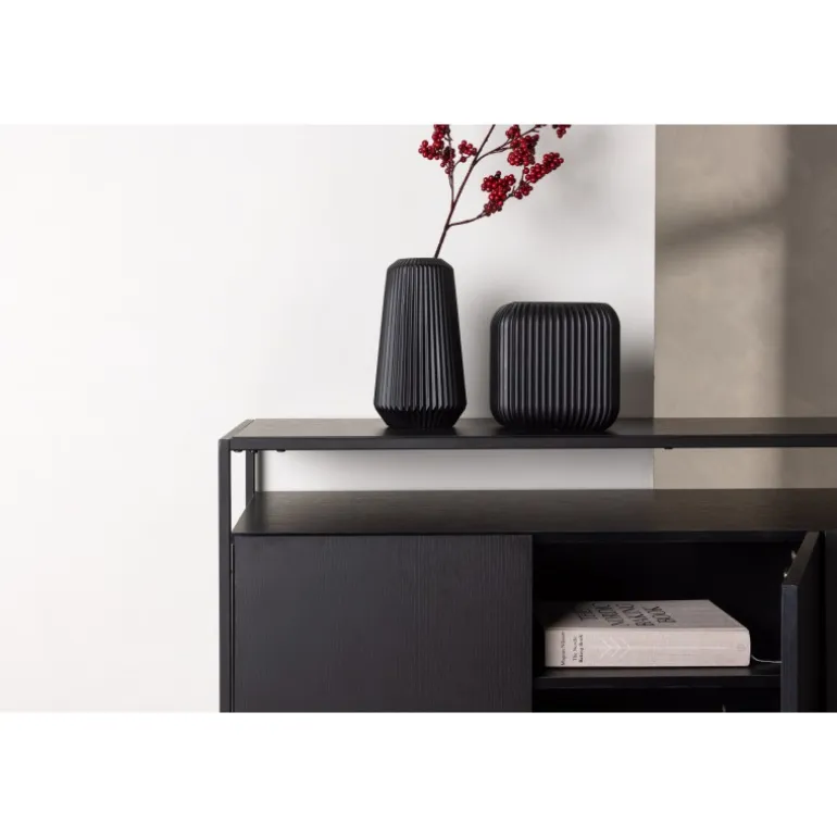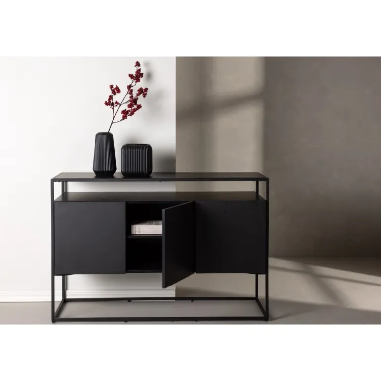 Kingsport Skabet kombinerer både skjult og synlig opbevaring og er lige så praktisk som det er stilfuldt! Takket være den generøse størrelse og tre hylder, er det rummeligt med plads til alle former for opbevaring, der skal placeres smart og stilfuldt. Lavet af sort MDF med en sort ramme i stål. Den minimalistiske ramme giver et elegant indtryk og gør det også nemt at støvsuge. Pynt bordpladen med smukke dekorationer og lysestager og fyld kontoret med alt, hvad du vil have der passer til!