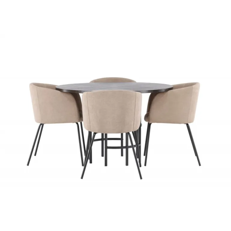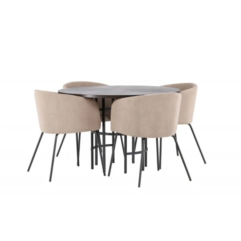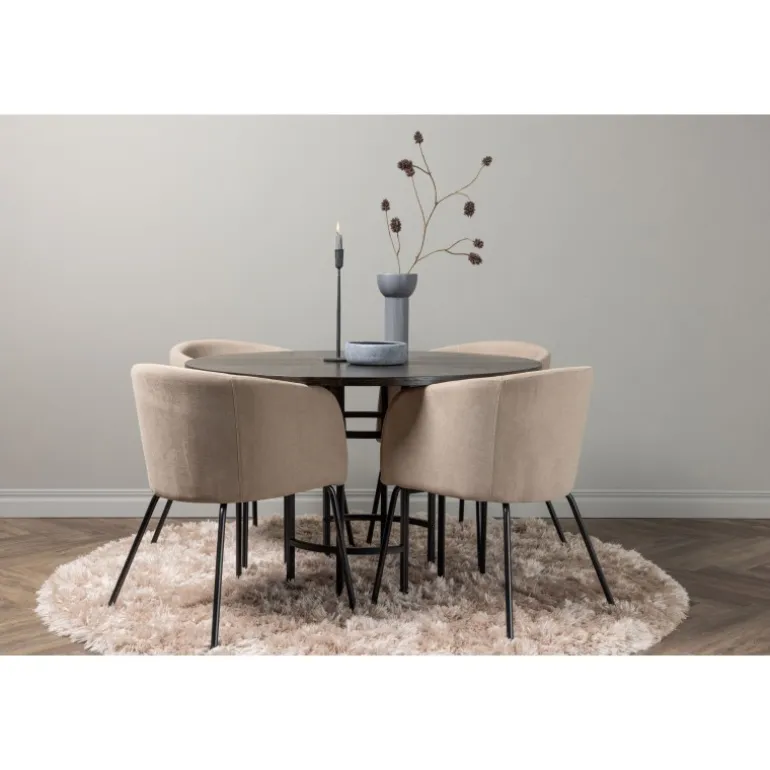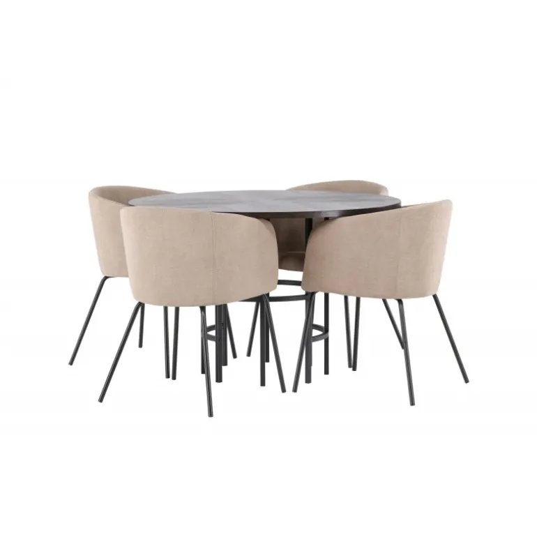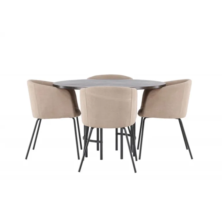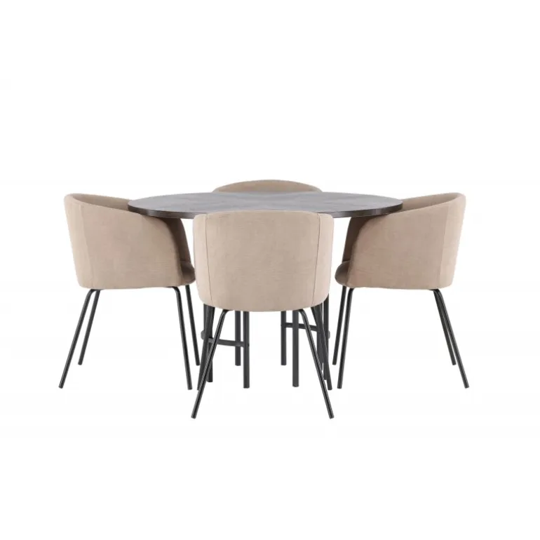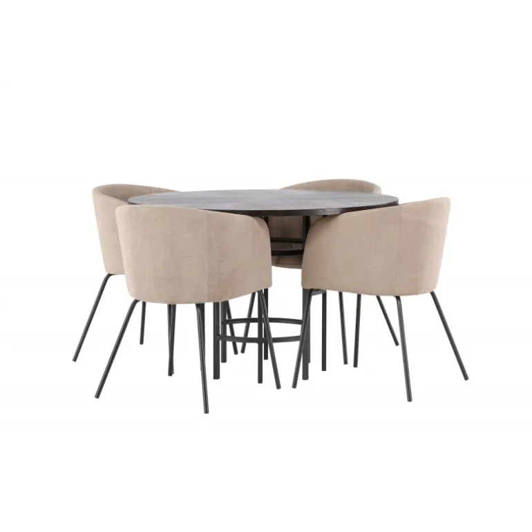 Oplev en utrolig Spisebordssæt med luksuriøst design! Vores runde spisebord København har en smuk brunfarvet bordplade i MDF med finer og en dekorativ, cylinderformet base i sort metal. Her sammen med vores komfortable spisebordsstole Berit. Stolen har et fuldt polstret design med en let afrundet ryg og sæde i polyesterlinned og smalle ben i sort jern. Her sidder du både behageligt og komfortabelt! Bordets diameter: 115 cm.