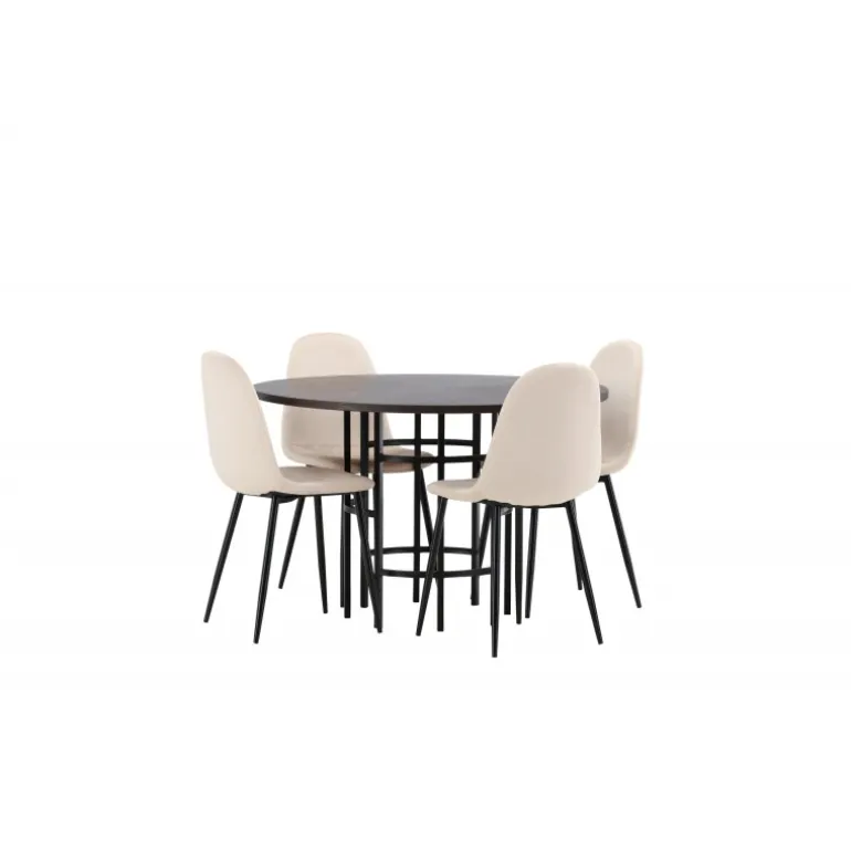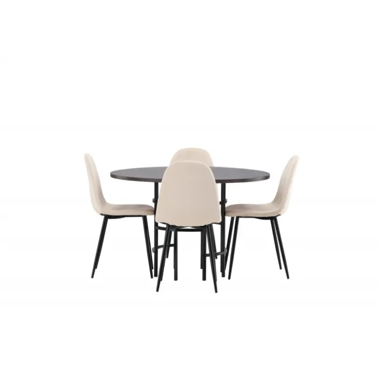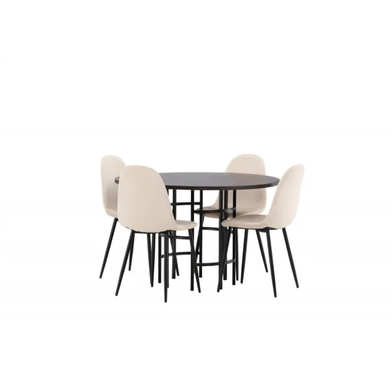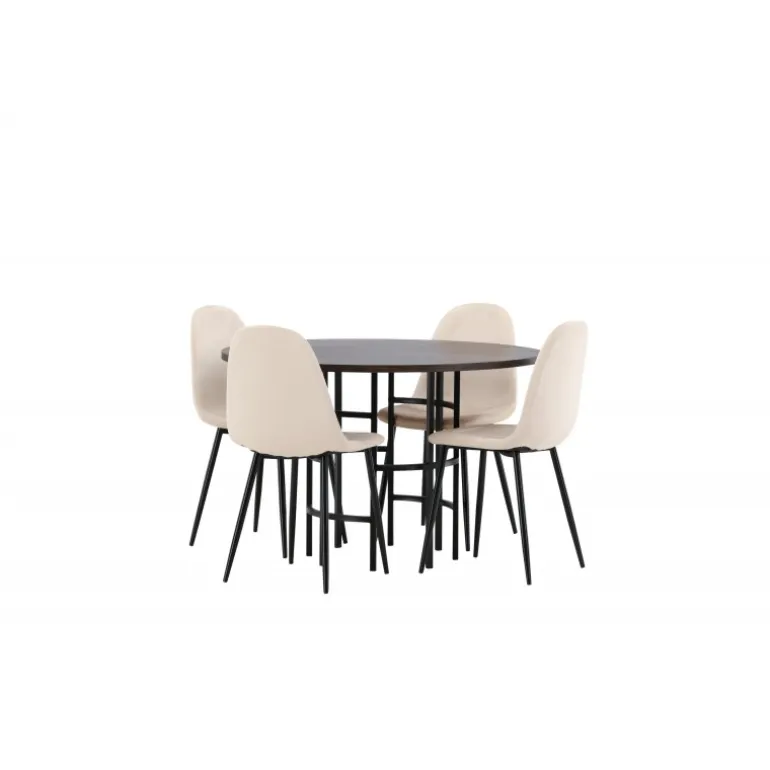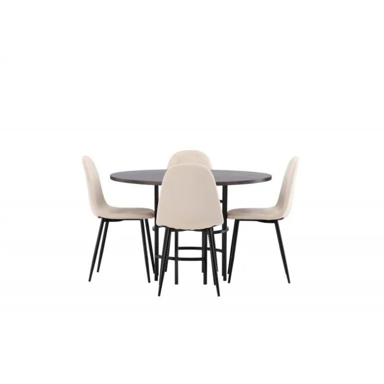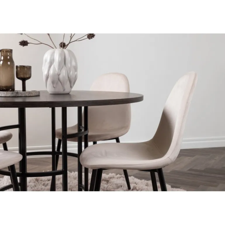 Stilfuldt, moderne og tidløst – en Spisebordssæt, der imponerer! Dette trend-sikre spisebord fra København-serien tilhører Furniture Fashion-kollektionen og har en smuk brunfarvet bordplade i MDF med finer og en dekorativ, cylinderformet base i sort metal. Her sammen med vores komfortable spisebordsstole fra Polar-serien. Stolen har et fuldt polstret design med en afrundet ryg og sæde i beige velourstof med blød polstring og ben i sort pulverlakeret metal. Undgå at gå på kompromis mellem komfort og design!