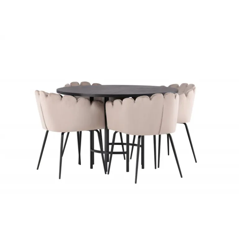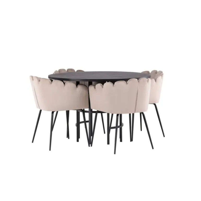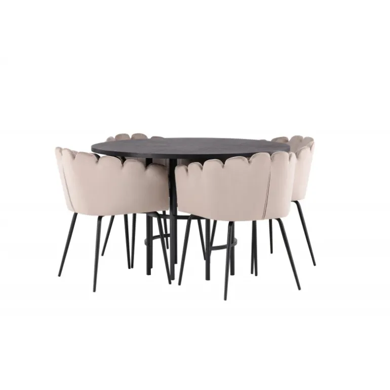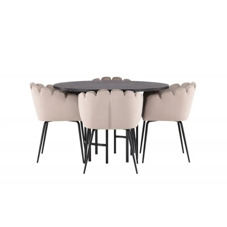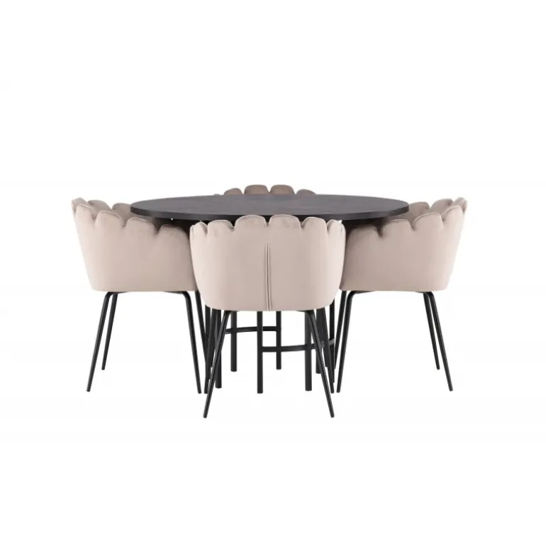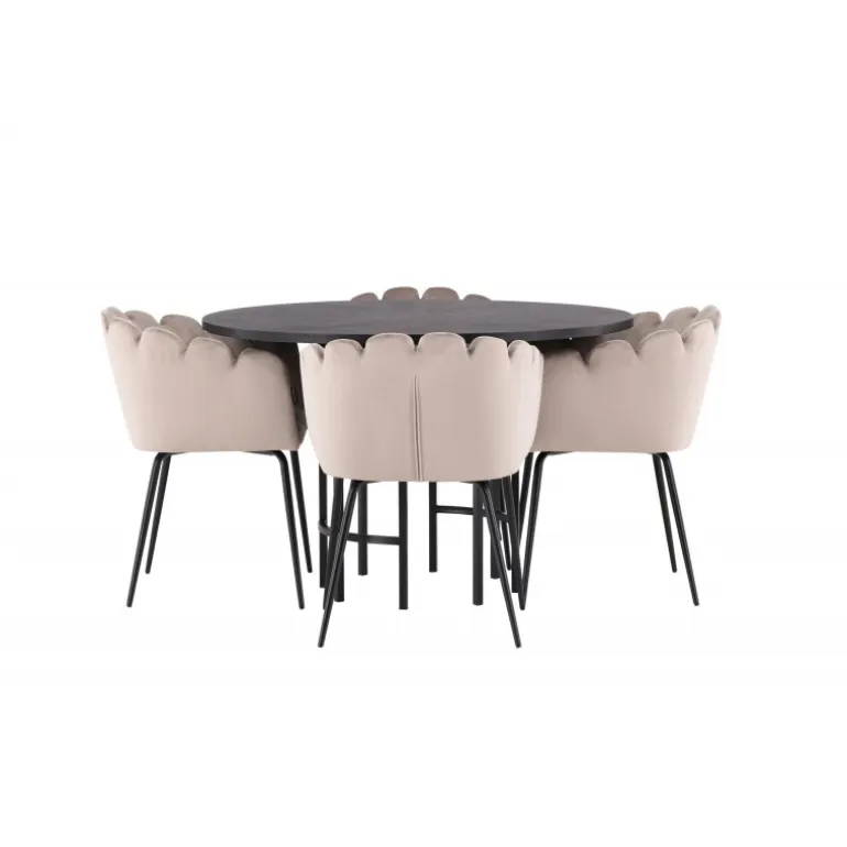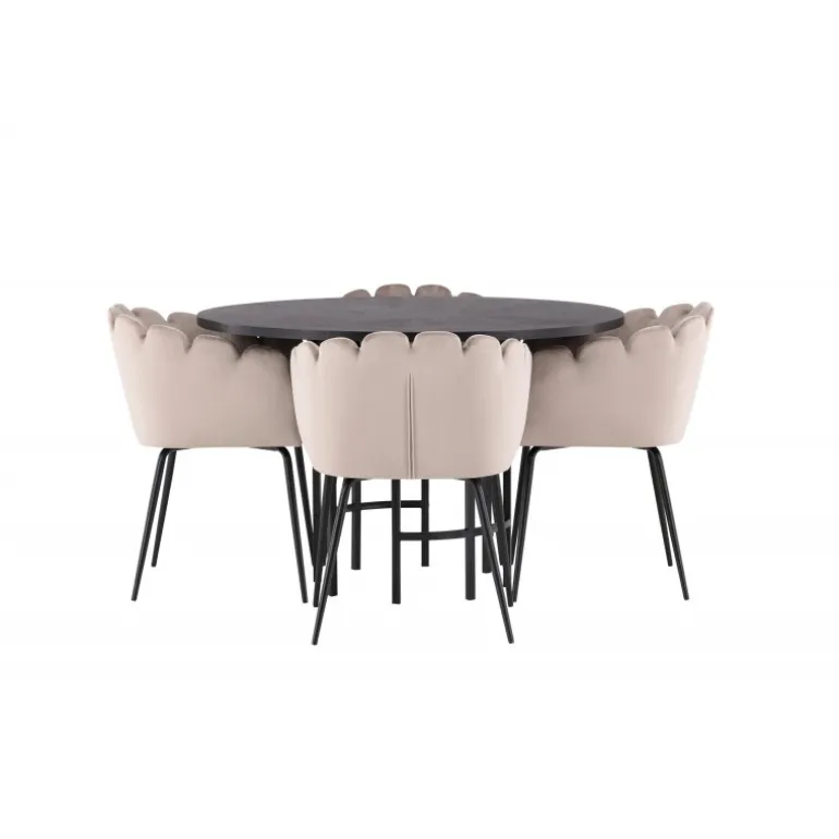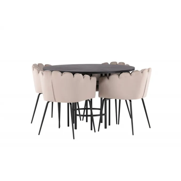 Det skal føles godt at komme hjem og slå sig ned! Vores runde spisebord København har en elegant, sort bordplade i MDF og en dekorativ, cylinderformet base i sort metal. Her sammen med vores populære spisestole Limhamn. Stolen har et indbydende design med en dekorativ muslingeskal-formet ryg med dekorative sting og et rundt sæde i smagfuld beige velourstof. Benene er i sort pulverlakeret metal. En uimodståelig Spisebordssæt! Borddimensioner: 115 cm.