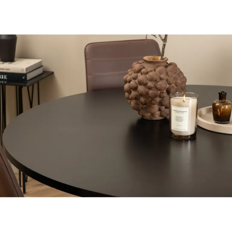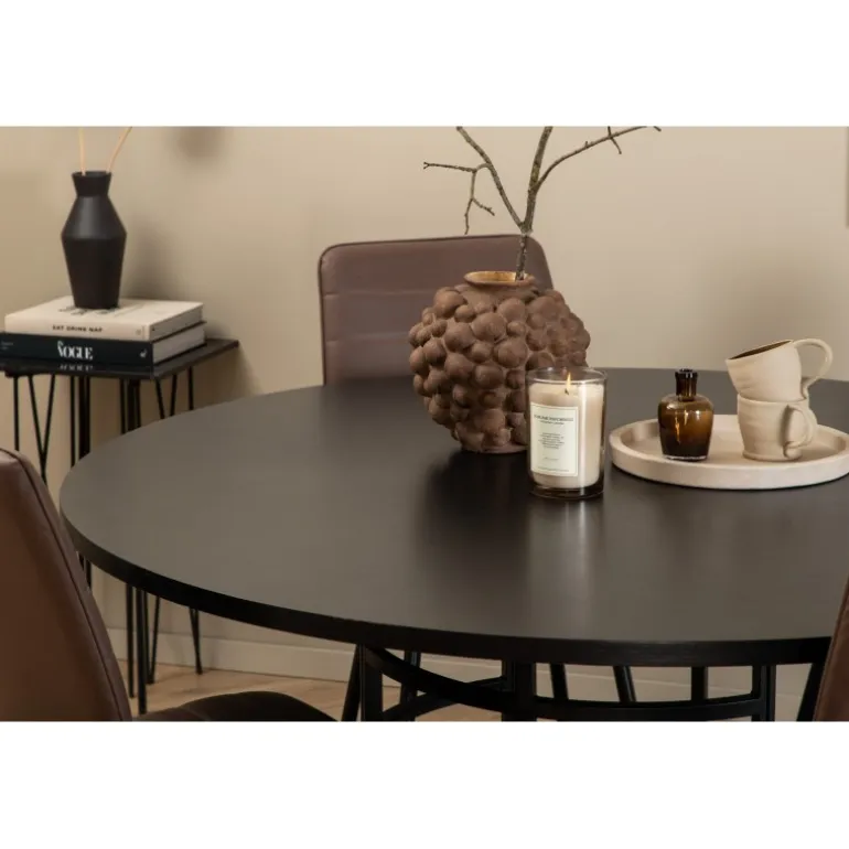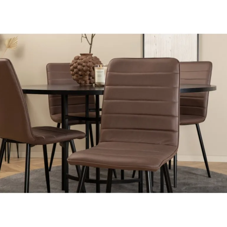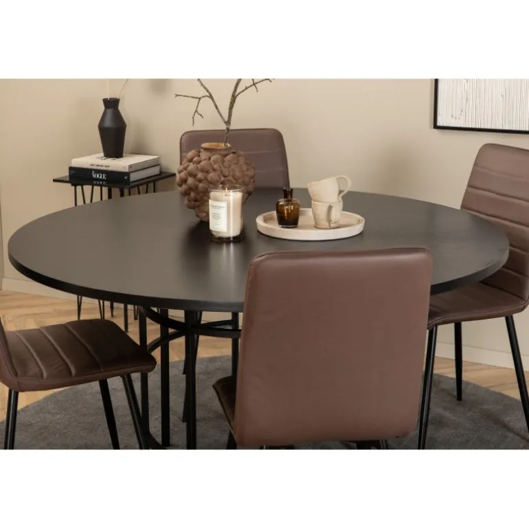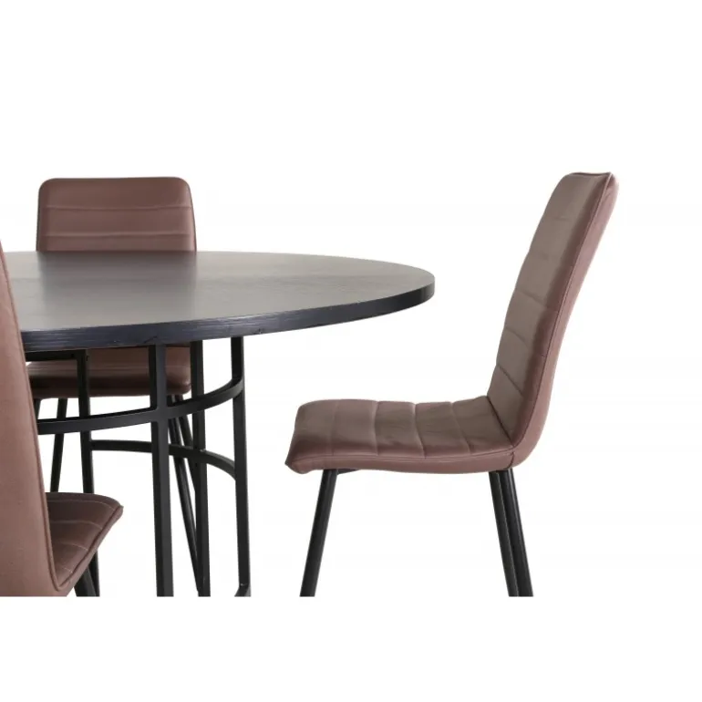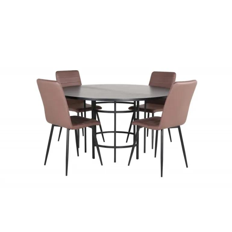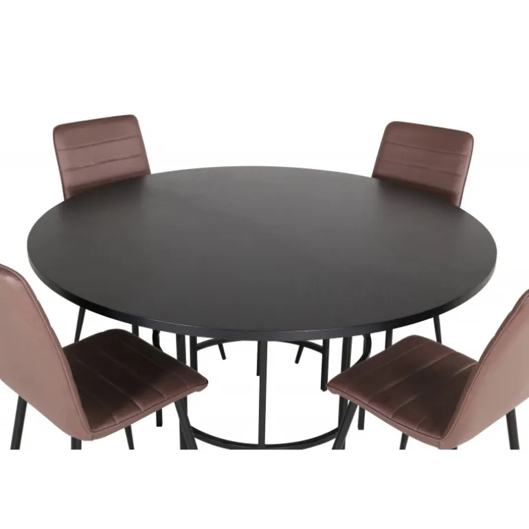 Stilfuldt, pompøst og indbydende – et Spisebordssæt, som alle vil elske! København spisbord har et tidløst design i en gennemgående sort farve med en bordplade i MDF med finer og en dekorativ, cylindrisk formet metalunderdel. Bordets diameter er 140 cm og højden er 74 cm. Sættet inkluderer fire Windu luksus spisestole med et strømlinet design. Stolens ben er i sort jern, og sæderne er i brun mikrofiber. Stolens dimensioner: Højde: 94 cm, sædehøjde: 47 cm, bredde: 43 cm, dybde: 49 cm. Sid behageligt og inviter til mange hyggelige måltider fremover!