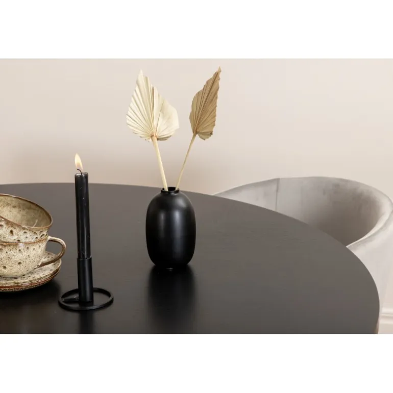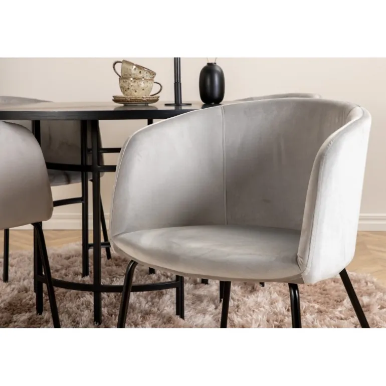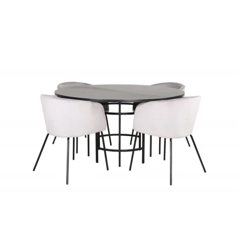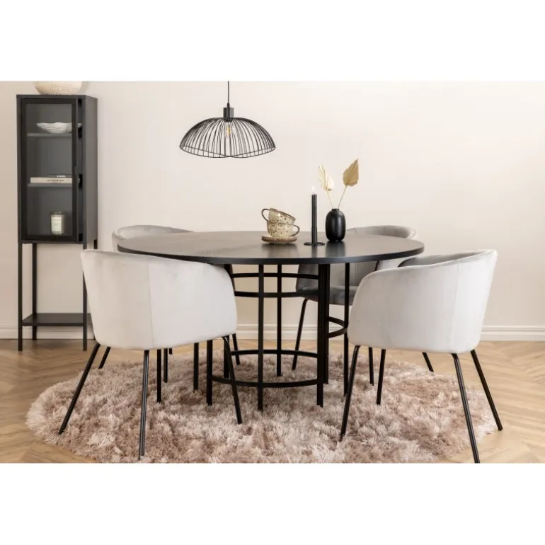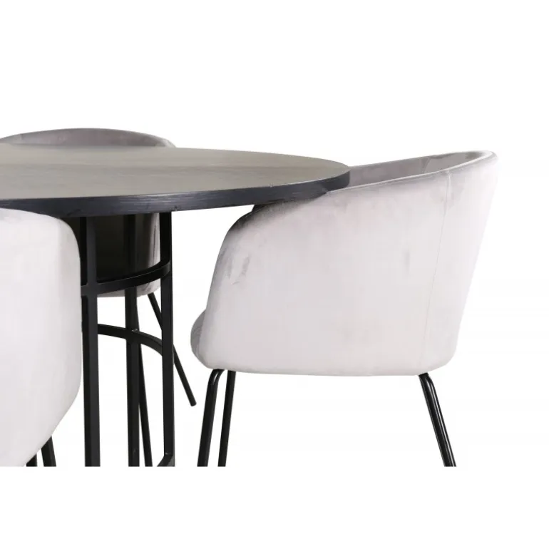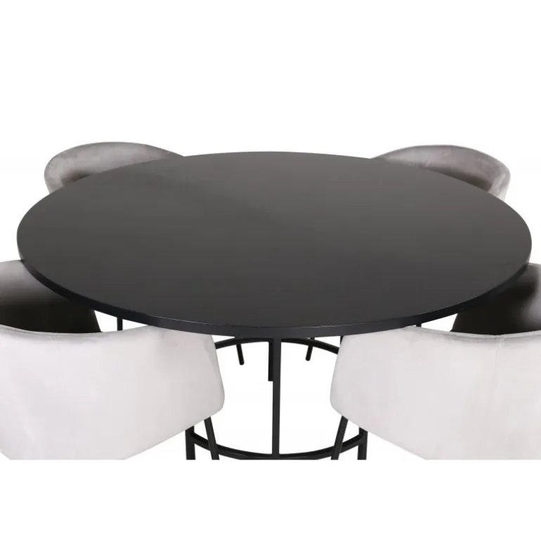 Skab et charmerende midtpunkt i hjertet af hjemmet med et rundt Spisebordssæt i et moderne look! København Spisebordssæt har et tidløst design i en konsekvent sort farve med en bordplade i MDF med finer og et dekorativt, cylindrisk formet metalstel. Bordets dimensioner: Diameter: 140 cm, Højde: 74 cm. Her matches det med 4 Berit spisebordsstole i et luksuriøst design. Stolene har et komfortabelt sæde i lys grå fløjl og stilfulde, smalle ben i jern. Stolens dimensioner: Højde: 78 cm, Sædehøjde: 49 cm, Bredde: 55 cm, Dybde: 55 cm. Indret til en hyggelig middagstid!