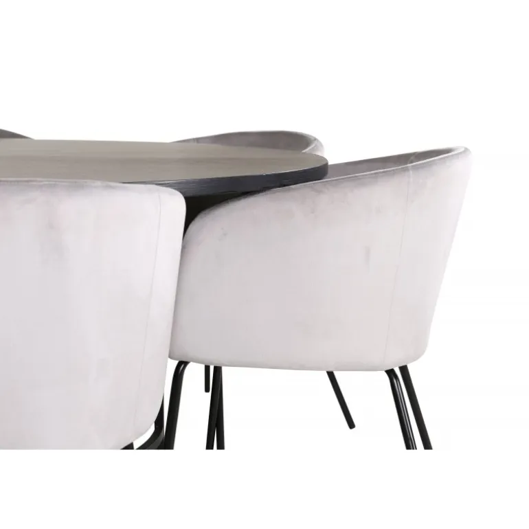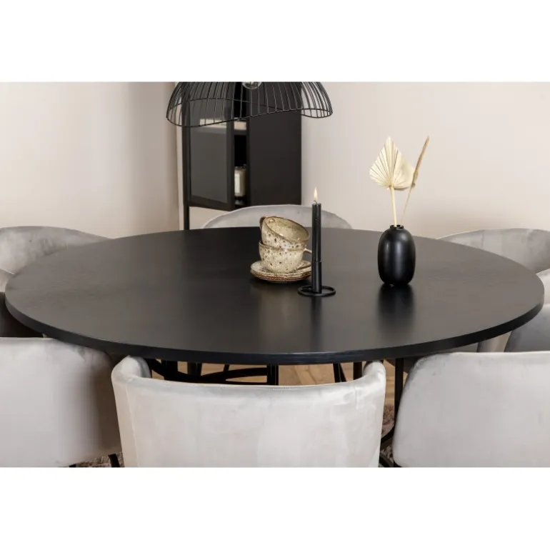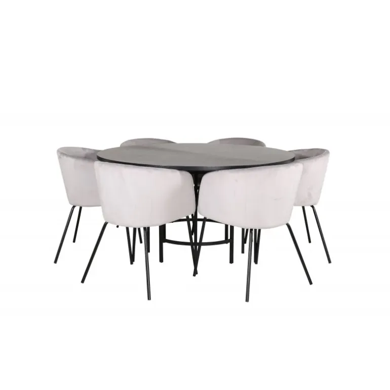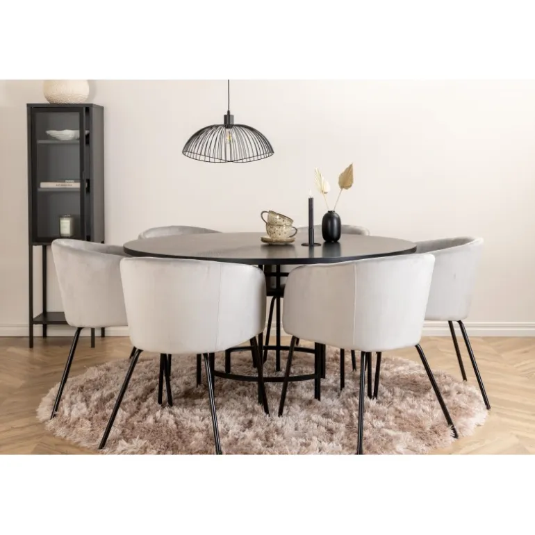 Skab et charmerende midtpunkt i hjemmets hjerte med et rundt spisebordssæt i moderne look! København spisebord har et tidløst design i gennemgående sort farve med en bordplade i MDF med finer og et dekorativt, cylindrisk formet metalunderstel. Bordets diameter: 140 cm, højde: 74 cm. Her er det matchet med 6 Berit spisebordsstole i luksuriøs design. Stolene har en komfortabel sæde i lysegrå velour og stilfulde, smalle ben i jern. Stolens dimensioner: Højde: 78 cm, sædehøjde: 49 cm, bredde: 55 cm, dybde: 55 cm. Indret til en hyggelig middagstid!
