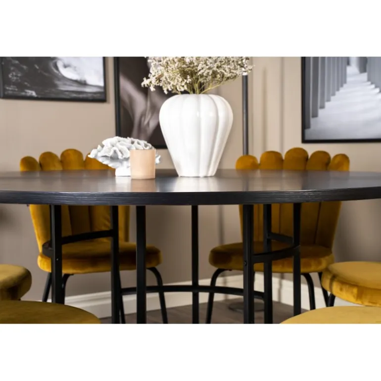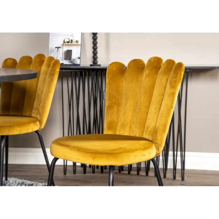 At købe en forudkomponeret Spisebordssæt er både trendsikker og praktisk! Her kombinerer vi vores spisebord København med vores siddevenlige spisebordsstole Limhamn. Lad hjemmets hjerte blive præget af din nye iøjnefaldende Spisebordssæt. Det sorte bord med gulddetaljer og de gule stole skaber et stilfuldt og moderne look i din spisestue.