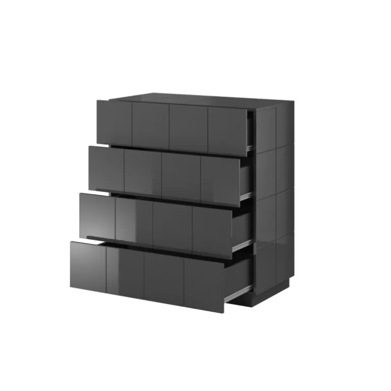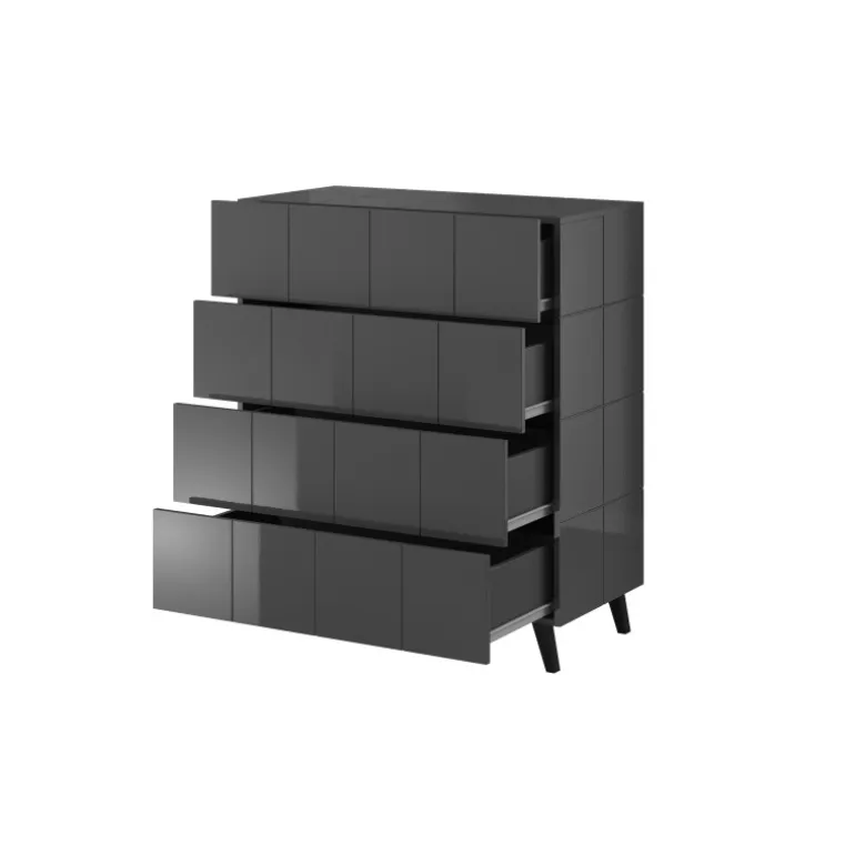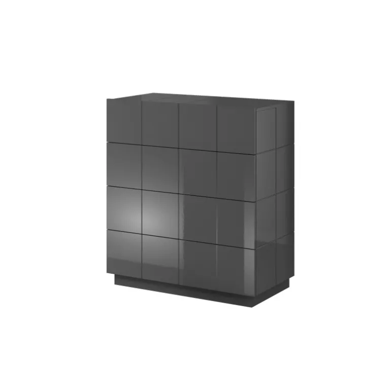 Oplev den stilfulde og funktionelle Kommode KOM4S REJA i elegant grafit glans. Denne kommode er designet til at passe perfekt ind i ethvert moderne hjem. Med sine dimensioner på 104 cm i højden (med ben) og 99 cm i højden (uden ben), 91 cm i bredden og 45 cm i dybden, giver den masser af opbevaringsplads uden at optage for meget gulvplads. Materialerne inkluderer glansfræsning MDF spånplade til sider og top samt lamineret spånplade til resten af elementerne. Kommoden har ingen håndtag, hvilket giver et rent og minimalistisk look, da fronten rækker over toppen. Den leveres med Sorte plastikben eller en sokkel og inkluderer en LED-strimmel til belysning, som kan fastgøres til soklen i enten hvid eller Blå farve.