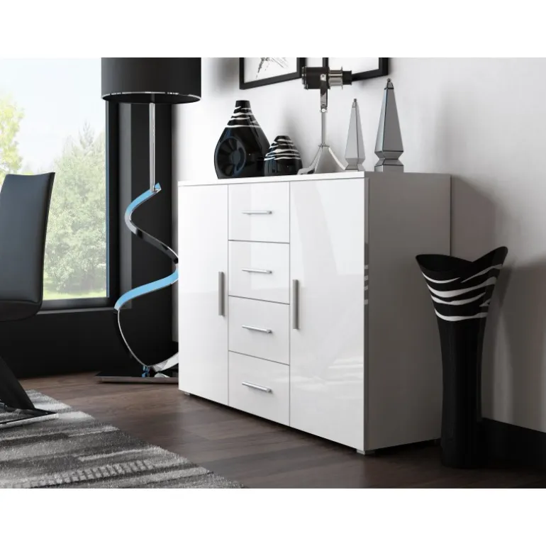Denne kommode UNI i hvid/hvid er den perfekte løsning til at organisere dit hjem. Med dimensionerne højde: 92 cm, bredde: 132 cm, dybde: 38 cm passer den perfekt til ethvert rum. Lavet af holdbare materialer som lamineret mat spånplade til kroppen og lamineret højglans MDF til fronten, sikrer denne kommode både stil og funktionalitet. De praktiske håndtag i plastmateriale gør det nemt at åbne og lukke skufferne.